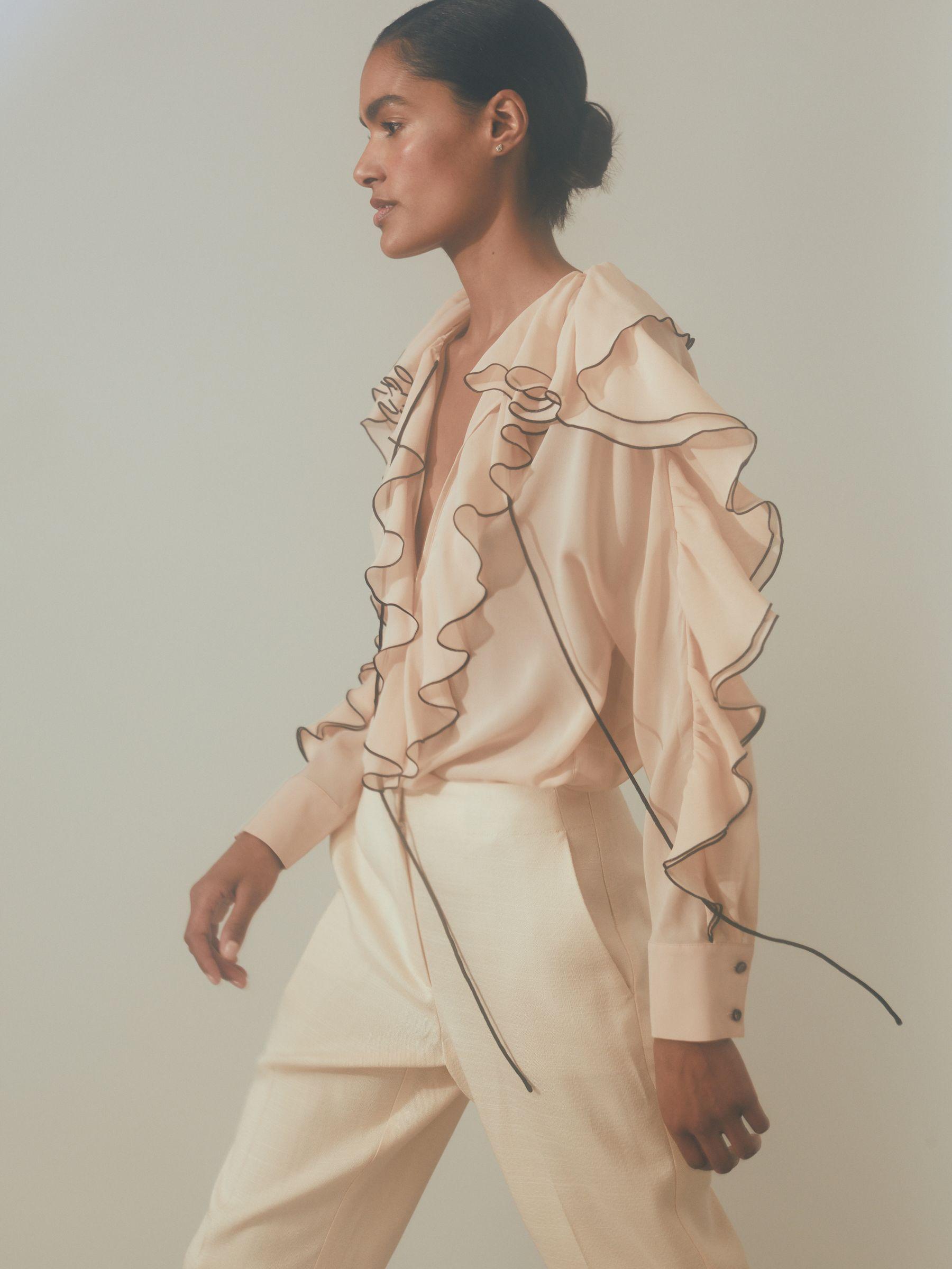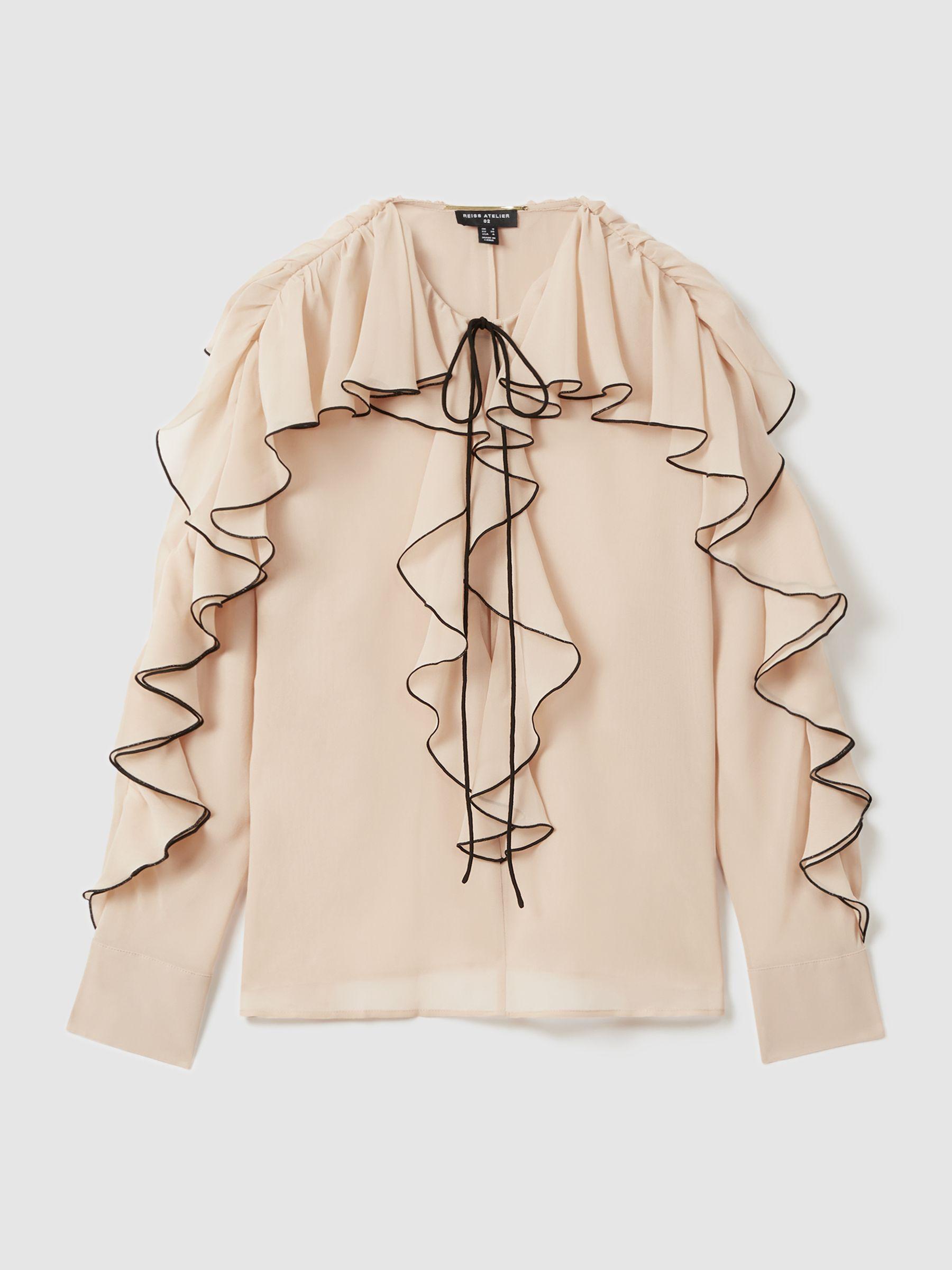 Luxe silk is spun into this lightweight, long-sleeve blouse. Hand-edged ruffles are added throughout and a traditional tie neck detail completes the style. 100% silk. Hand-edged ruffle detailing. Tie neck detail. Split hem. Reiss Atelier is an effortlessly chic collection of timeless wardrobe staples and occasion pieces that can be worn - and loved - for many years.