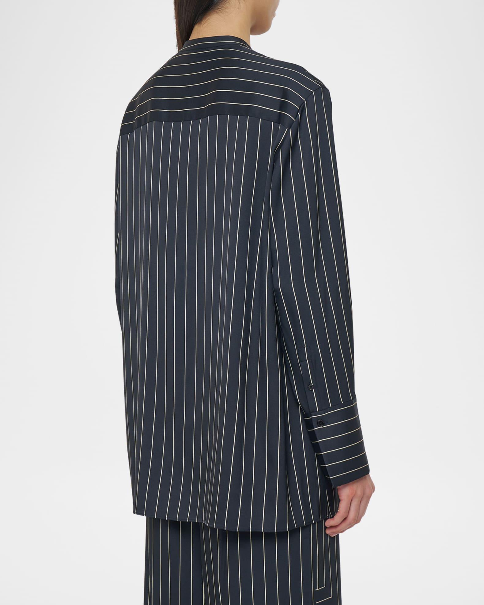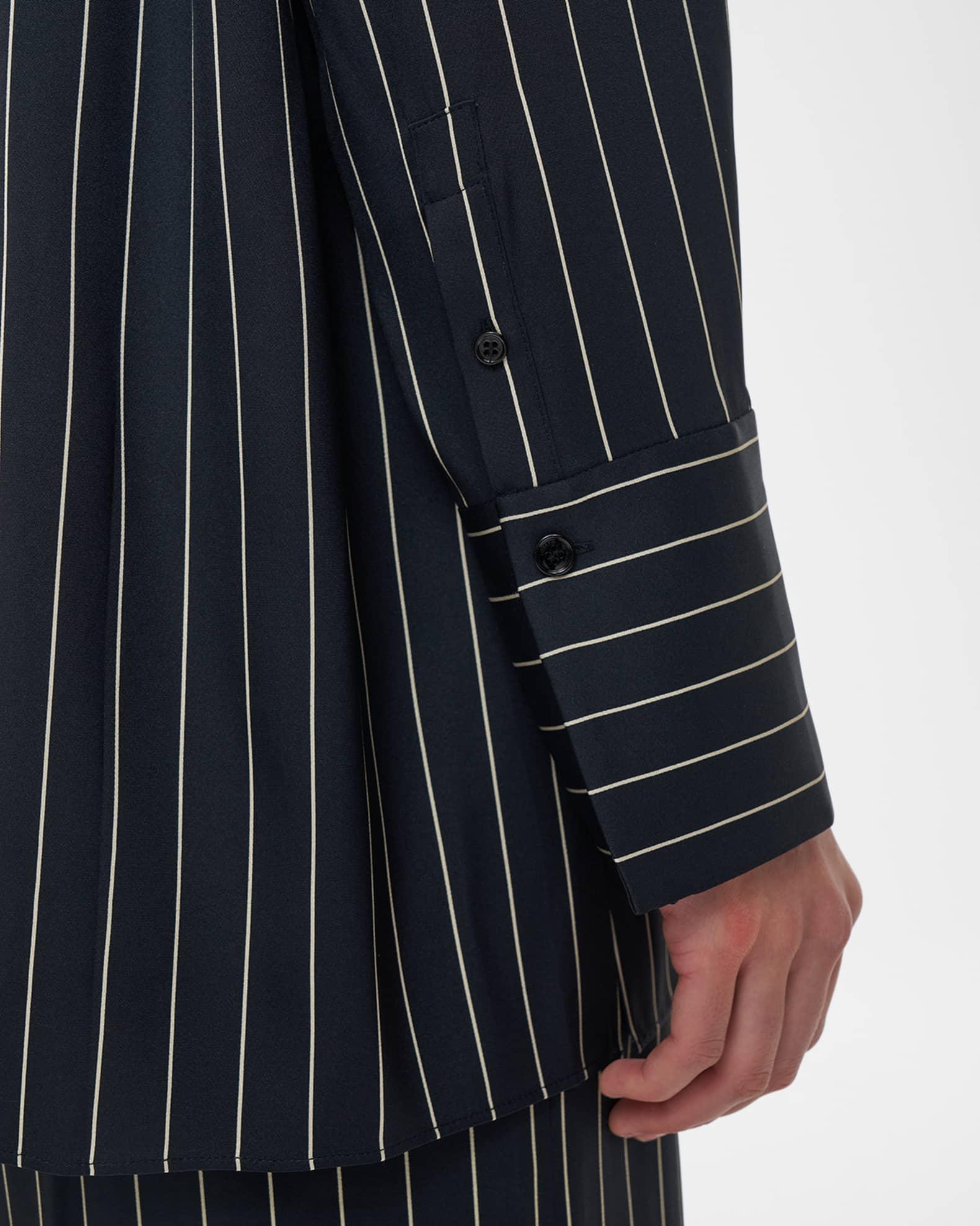 Crafted in a lustrous and fluid blend of silk and viscose, the "Athena" blouse from Joseph is printed with contrast geometric stripes Band collar; concealed button front Long sleeves Button cuffs Back yoke Hem side slits Relaxed fit Silk/viscose/spandex Dry clean Imported