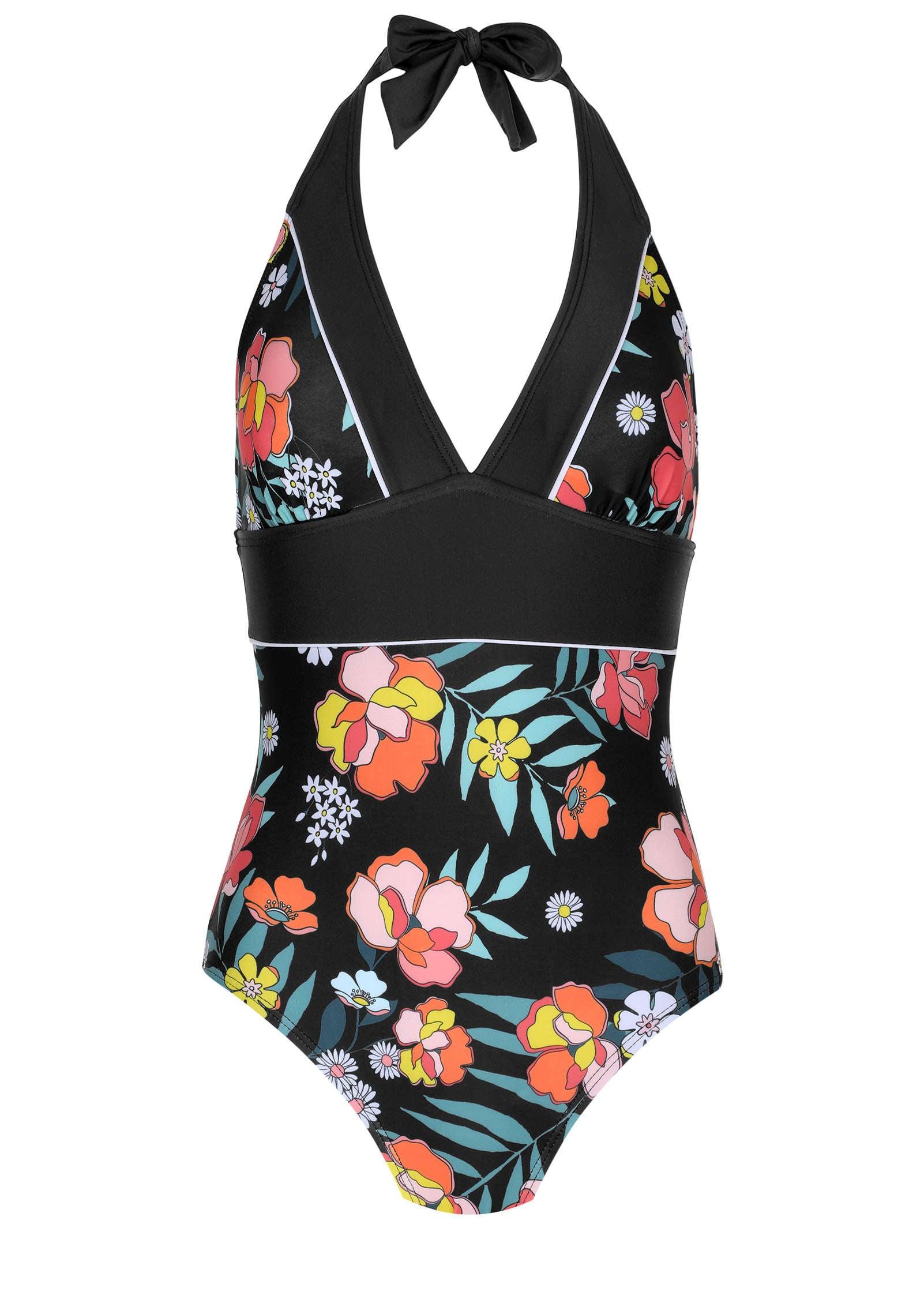 Bring out the bohemian babe in you! Deep neckline and empire waist.* Fuller halter cups tie behind the neck and have removable shaping cups* Full back with moderate rear coverage and lower leg line* For printed items; placement may vary* Domestic or import of quality poly/spandex tricot