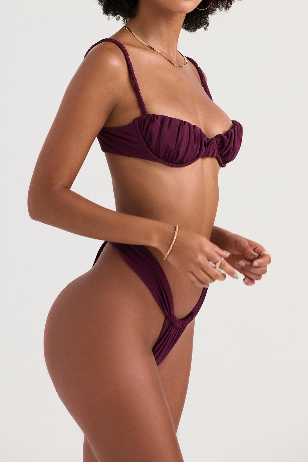 The ruching on our 'Cassis' bikini top is so delicate and elegant, making it an ultra chic choice for sunkissed days at the beach. It's made from our stretch swim fabric and has underwired cups that lift and shape the bust for the most amazing cleavage with a swan hook fastening to the back. The elasticated, gathered straps are so pretty and rest gently on the shoulders. Wear yours with our 'Athens' bikini bottoms or mix it up and pair with our 'Kos' reversible bikini bottoms in prune/olive floral depending on your vibe.