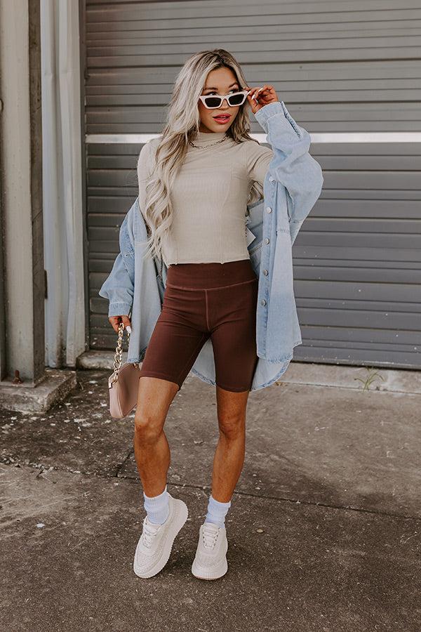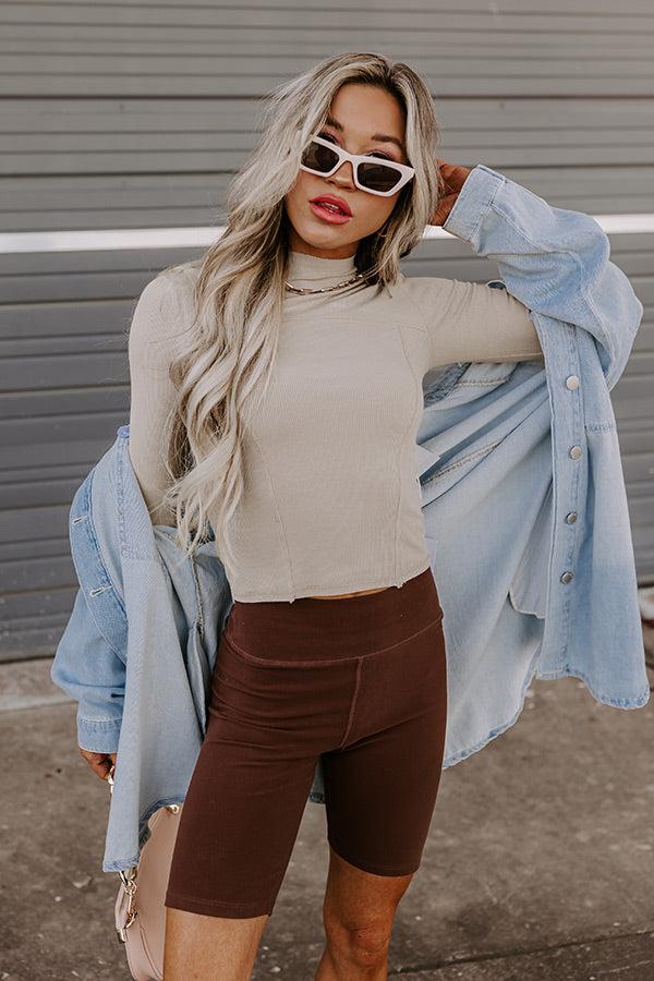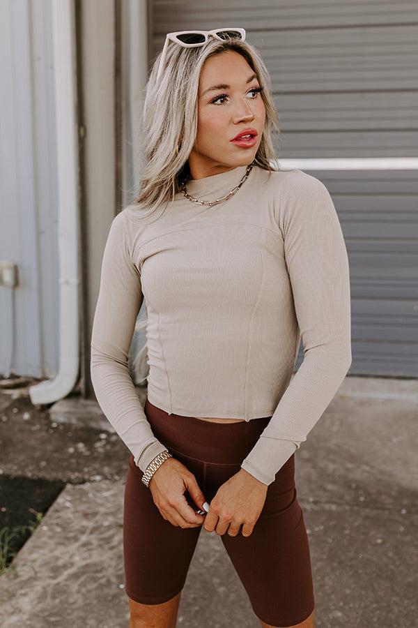 - Get in an athletic frame of mind with this trendy top! - Luxe ribbed material - A mock neckline with unfinished detail - Long fitted sleeves - Figure flattering seam detail - A sculpted silhouette that ends in a straight hemline