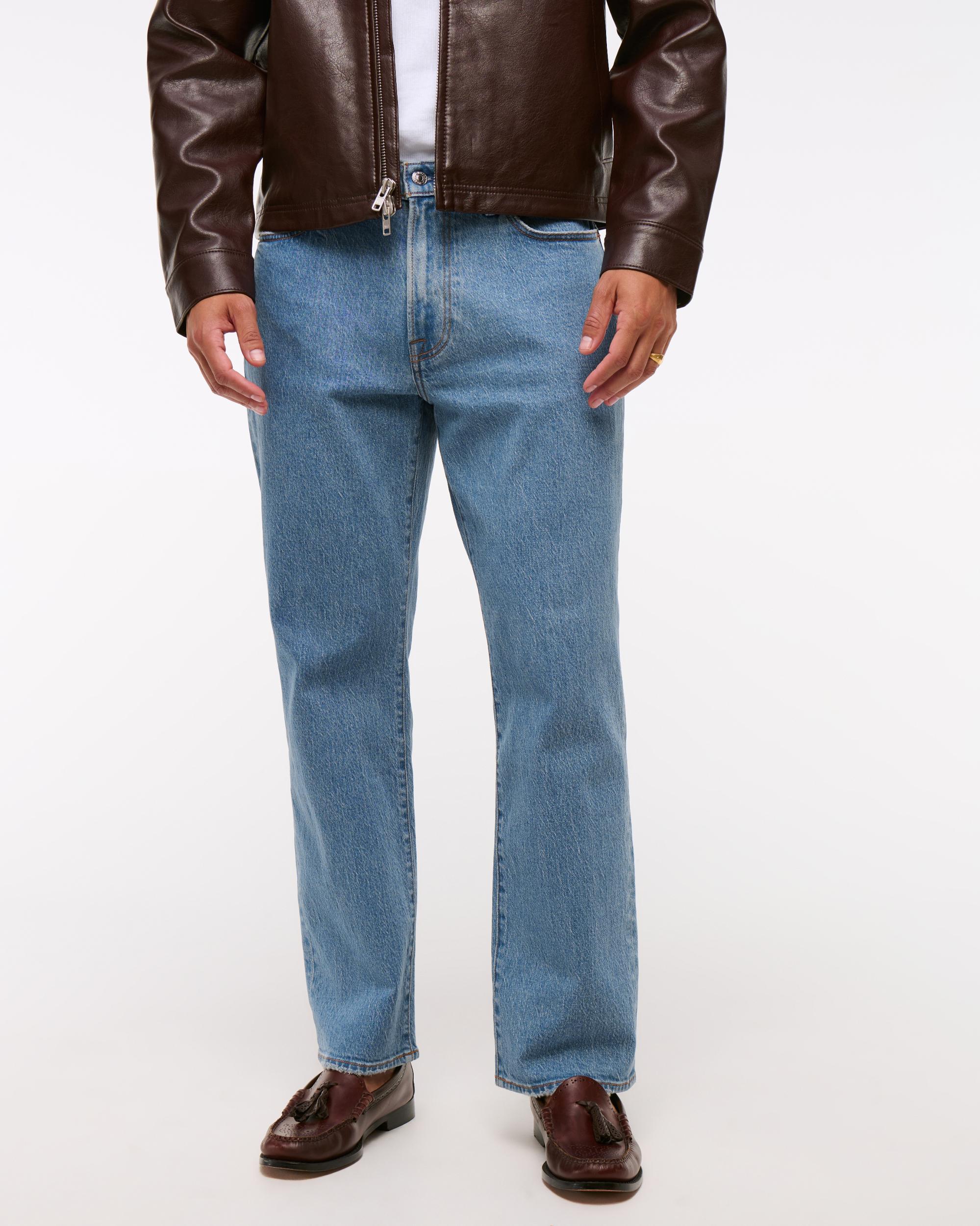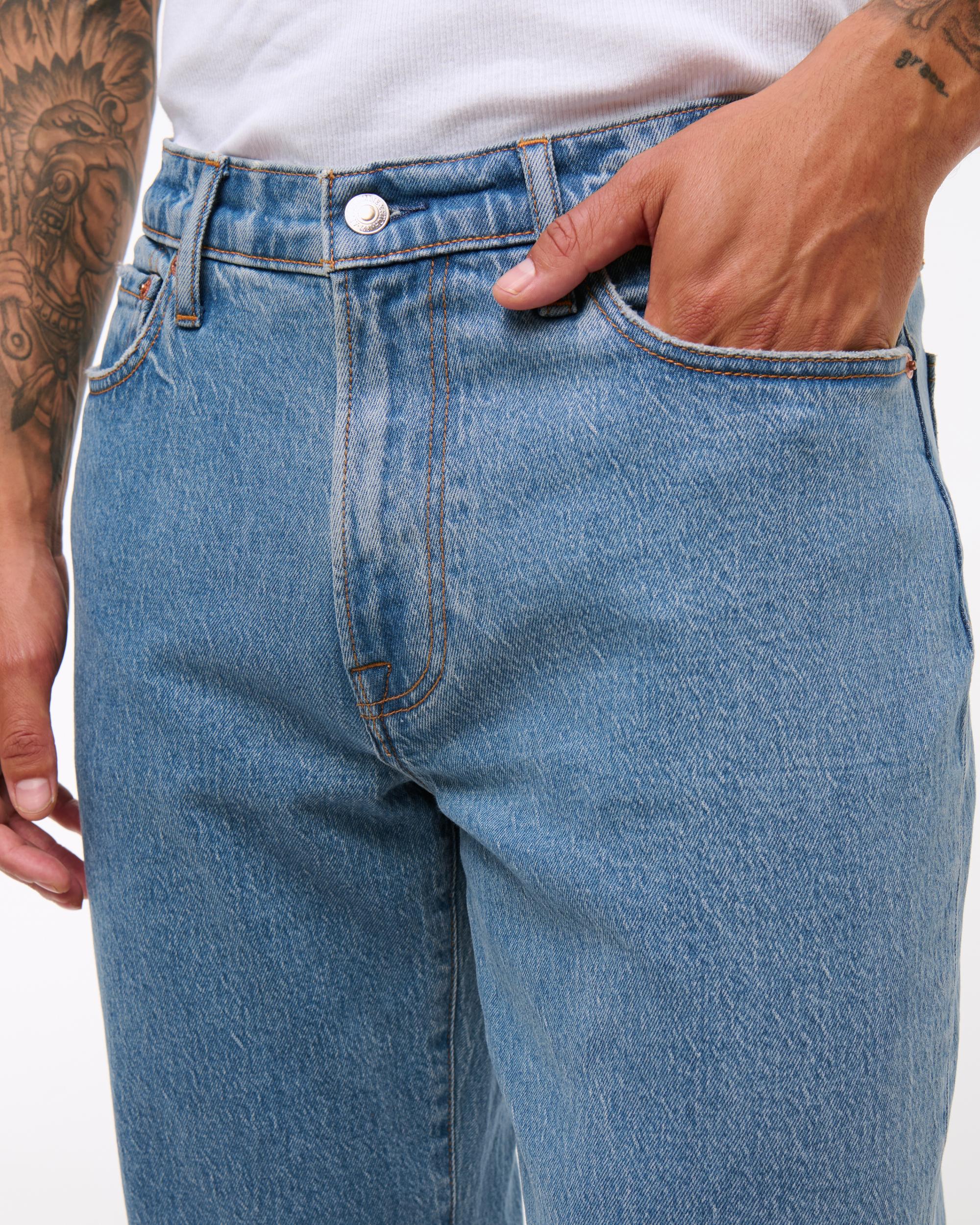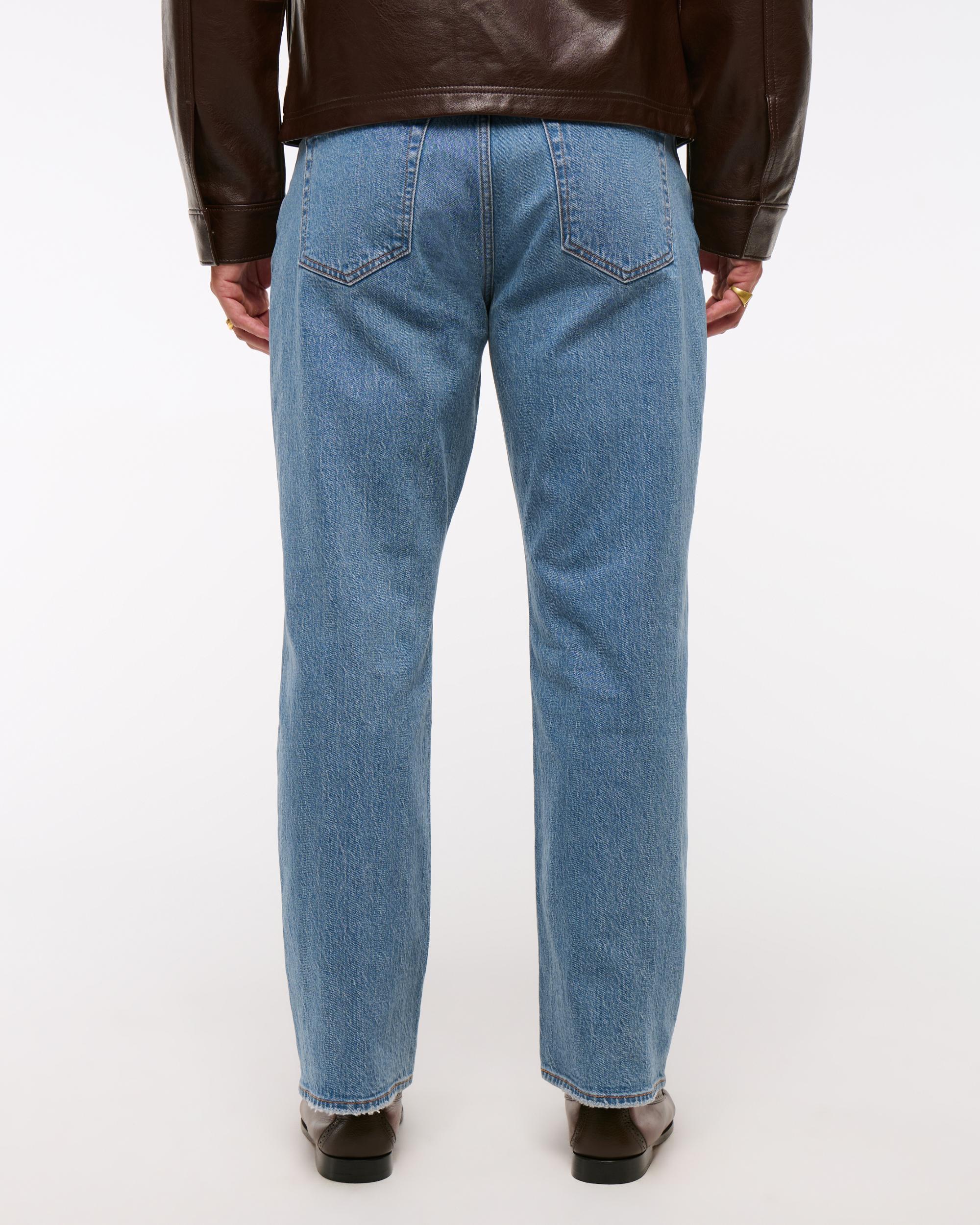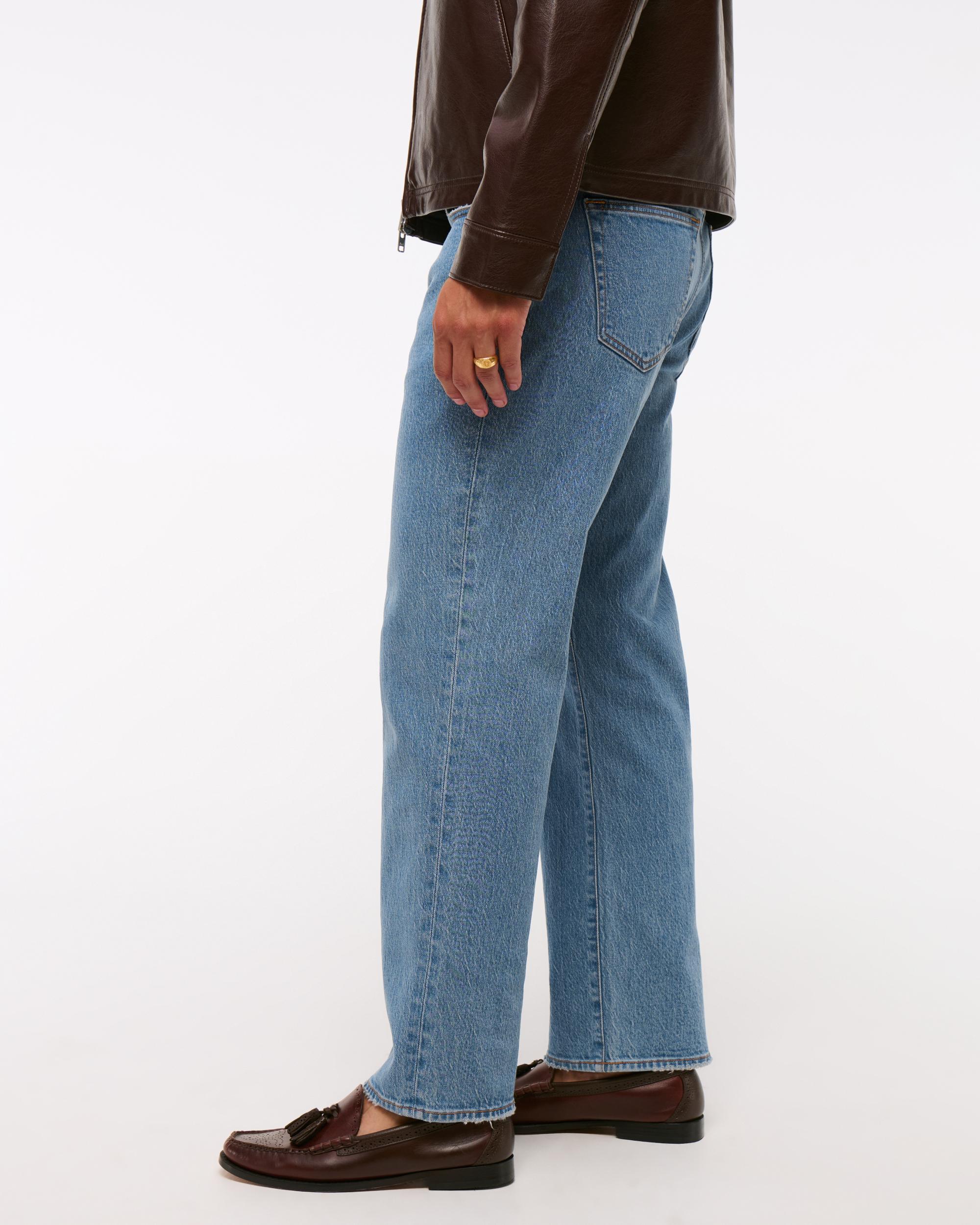 Our new athletic relaxed straight fit that is relaxed through the thigh and straight leg, made in our vintage stretch fabric and broken-in denim feel. Our athletic fit gives more room through the thigh and seat, featuring added stretch for comfort. Features a medium wash and frayed hem.