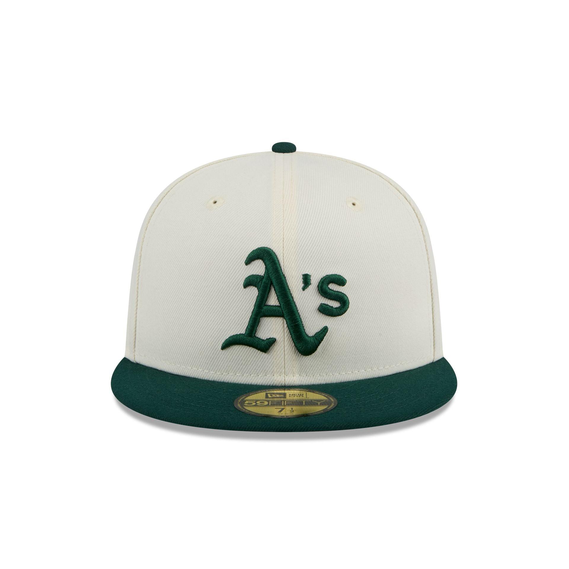 The Athletics Chrome 59FIFTY Fitted Cap features an embroidered Athletics logo at the front panels with a matching MLB Batterman logo at the rear, a green visor, and a gray undervisor.
