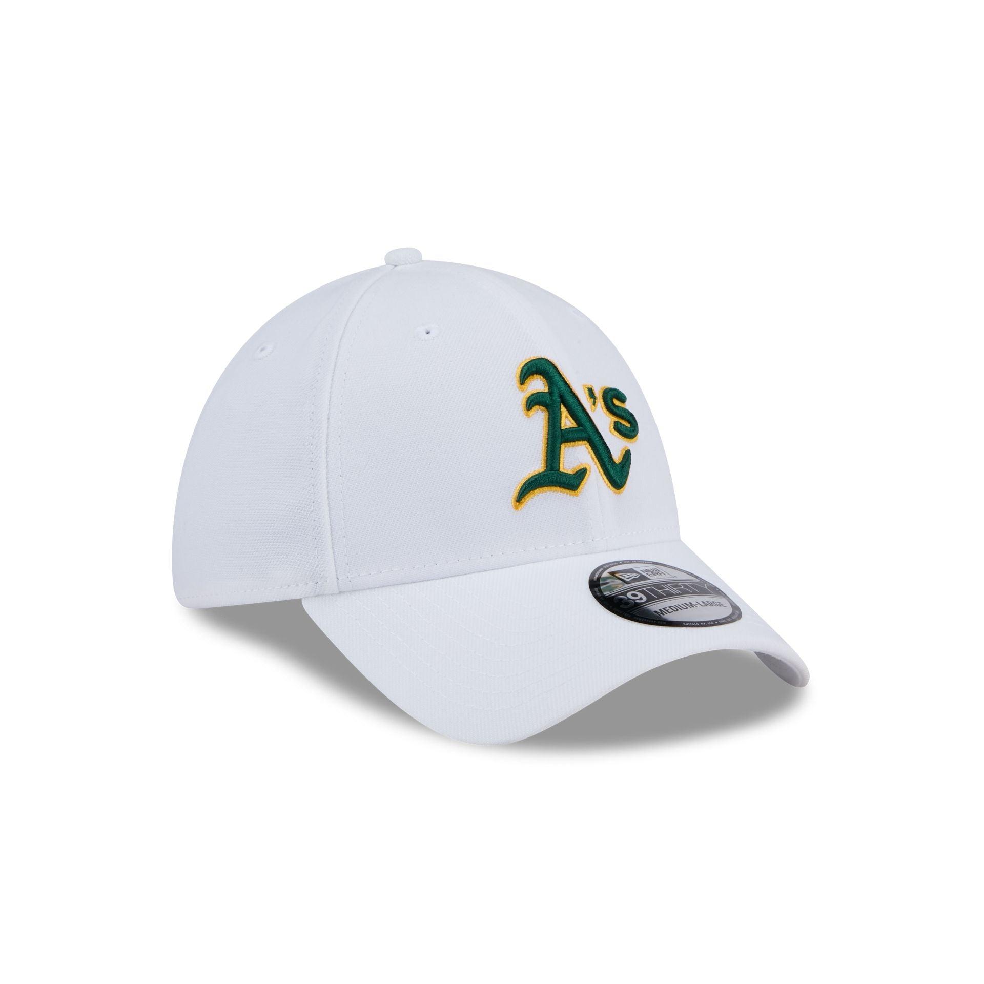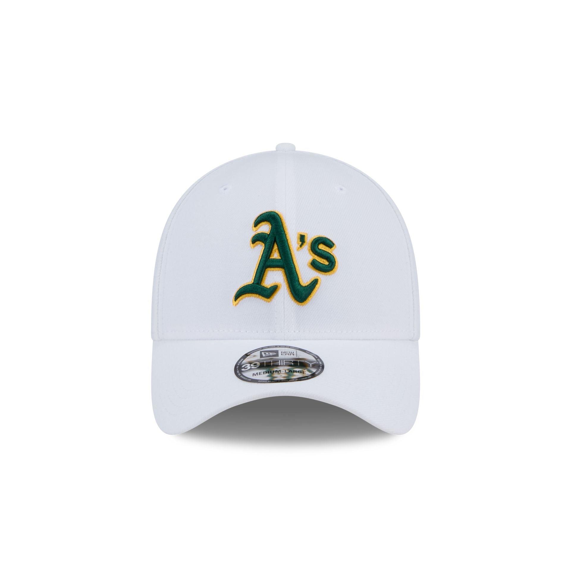 The Oakland Athletics Optic White 39THIRTY Stretch Fit Hat features an embroidered Athletics logo at the front panels with a matching team wordmark at the rear and a white undervisor.