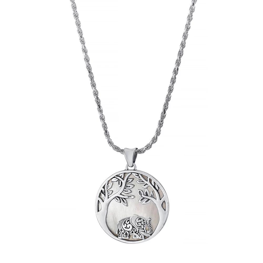 Add something new to your everyday look with this mother-of-pearl elephant scene pendant necklace. Add something new to your everyday look with this mother-of-pearl elephant scene pendant necklace. Mother-of-pearl inlay Nickel free Metal: sterling silver Chain length: 18 in. Finish: oxidized, polished, textured Pendant size: 1.3"L x 1.1"W Chain type: rope Gemstones may have been treated to enhance their appearance. Special care may be required. Please visit our Gemstone Treatment & Special Care Guide for more information. Size: 18". Color: White. Gender: female. Age Group: adult.