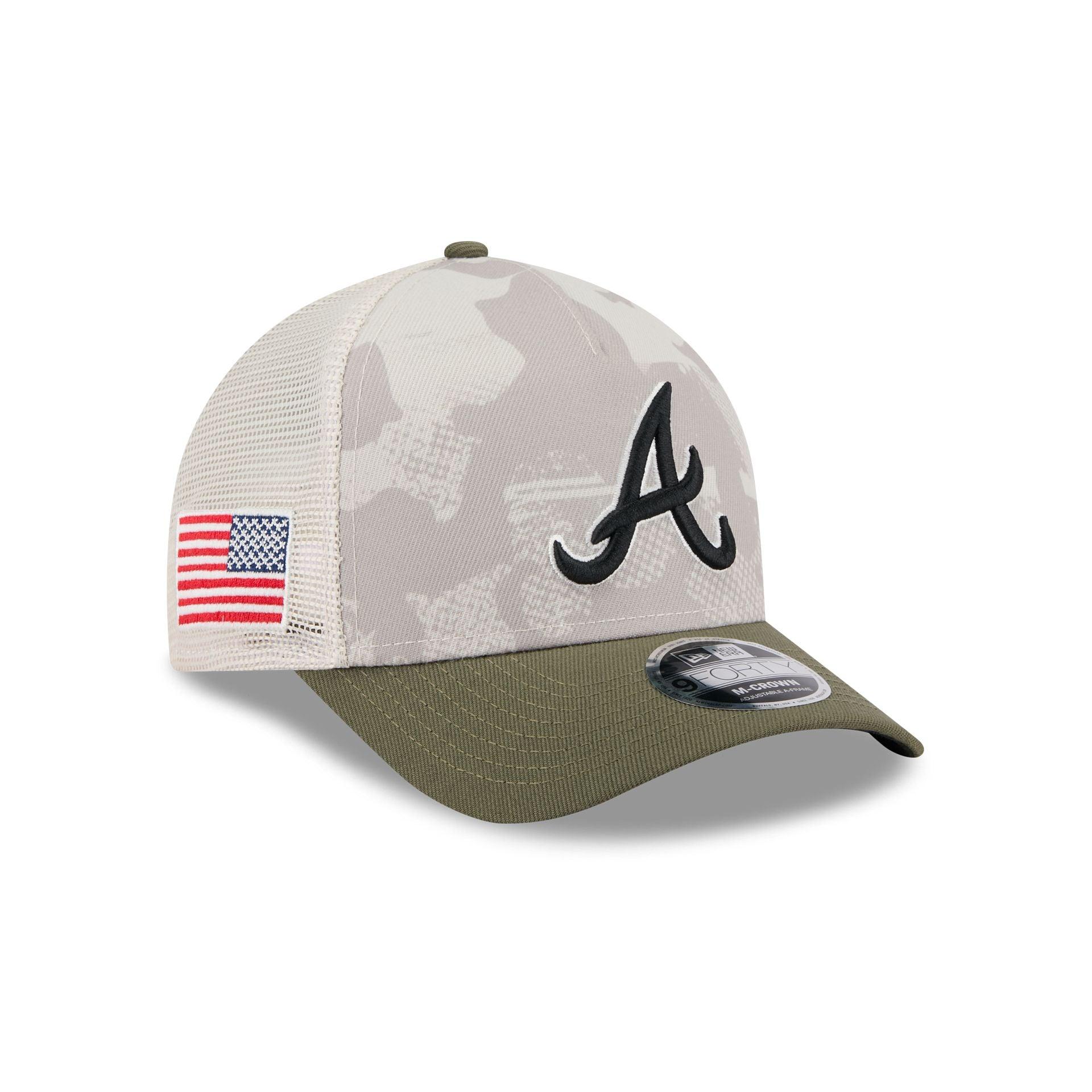 The Atlanta Braves Armed Forces Day 2025 9FORTY M-Crown A-Frame Trucker features an embroidered Braves logo at the front panels with the American Flag embroidered at the right-wear side. Additional details include an MLB Batterman logo above a snapback closure at a mesh rear and a black undervisor.