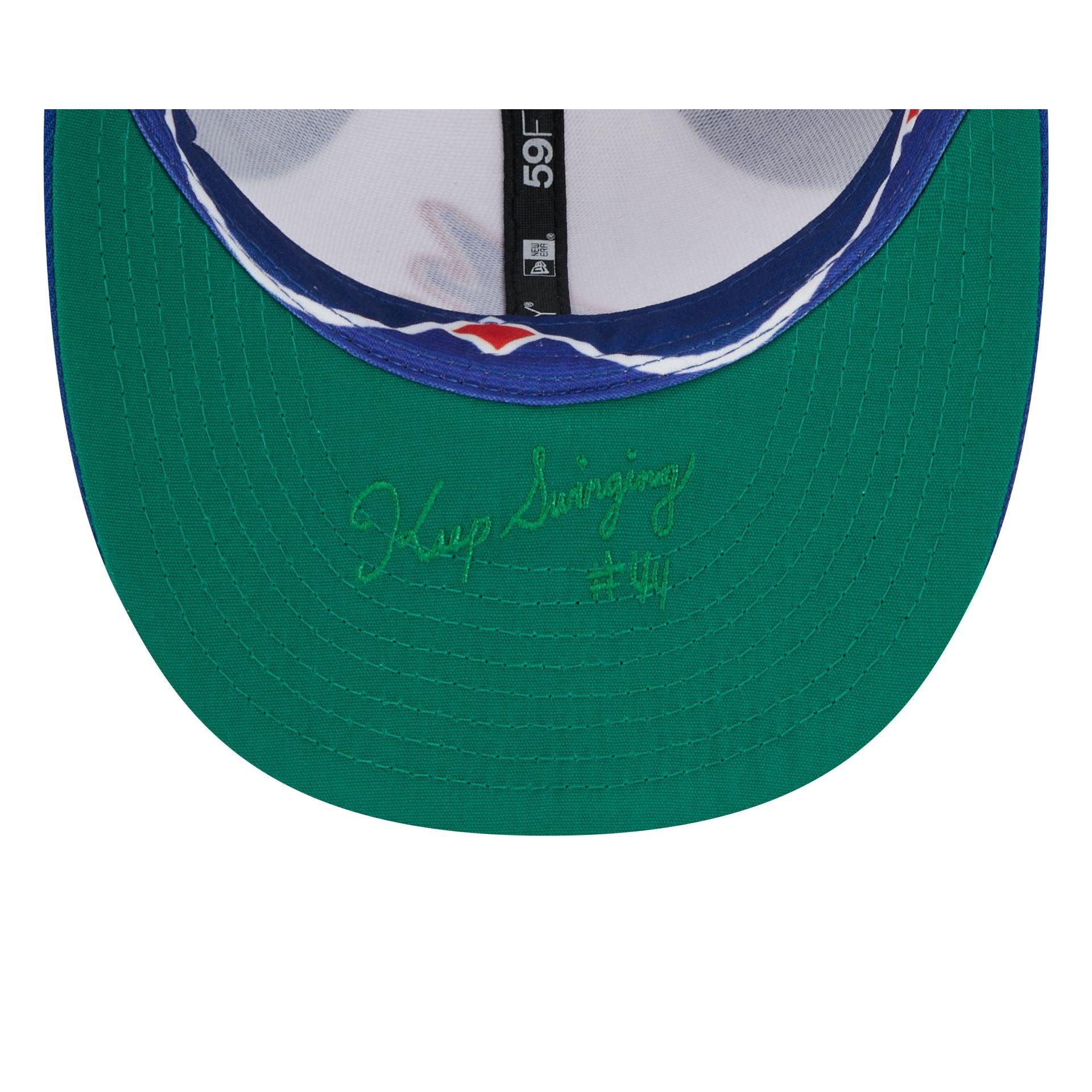 Jersey inspired, city connected. The Atlanta Braves City Connect Low Profile 59FIFTY Fitted Cap draws originality from unique elements tied to the surrounding city and features an embroidered Braves logo at the front panels with a matching MLB Batterman logo at the rear. Additional details include a Keep Swinging #44 script embroidered at the green undervisor and a printed sweatband.