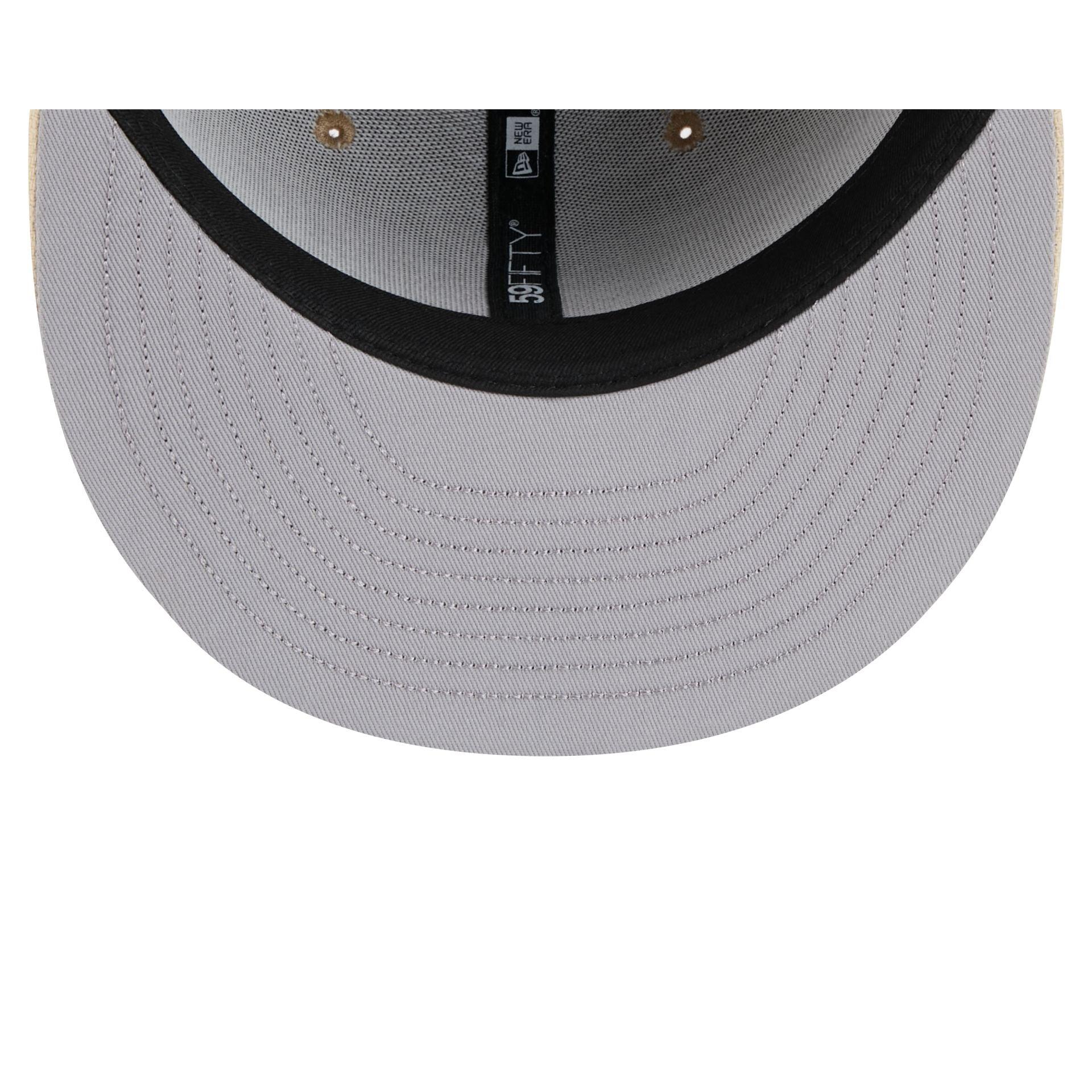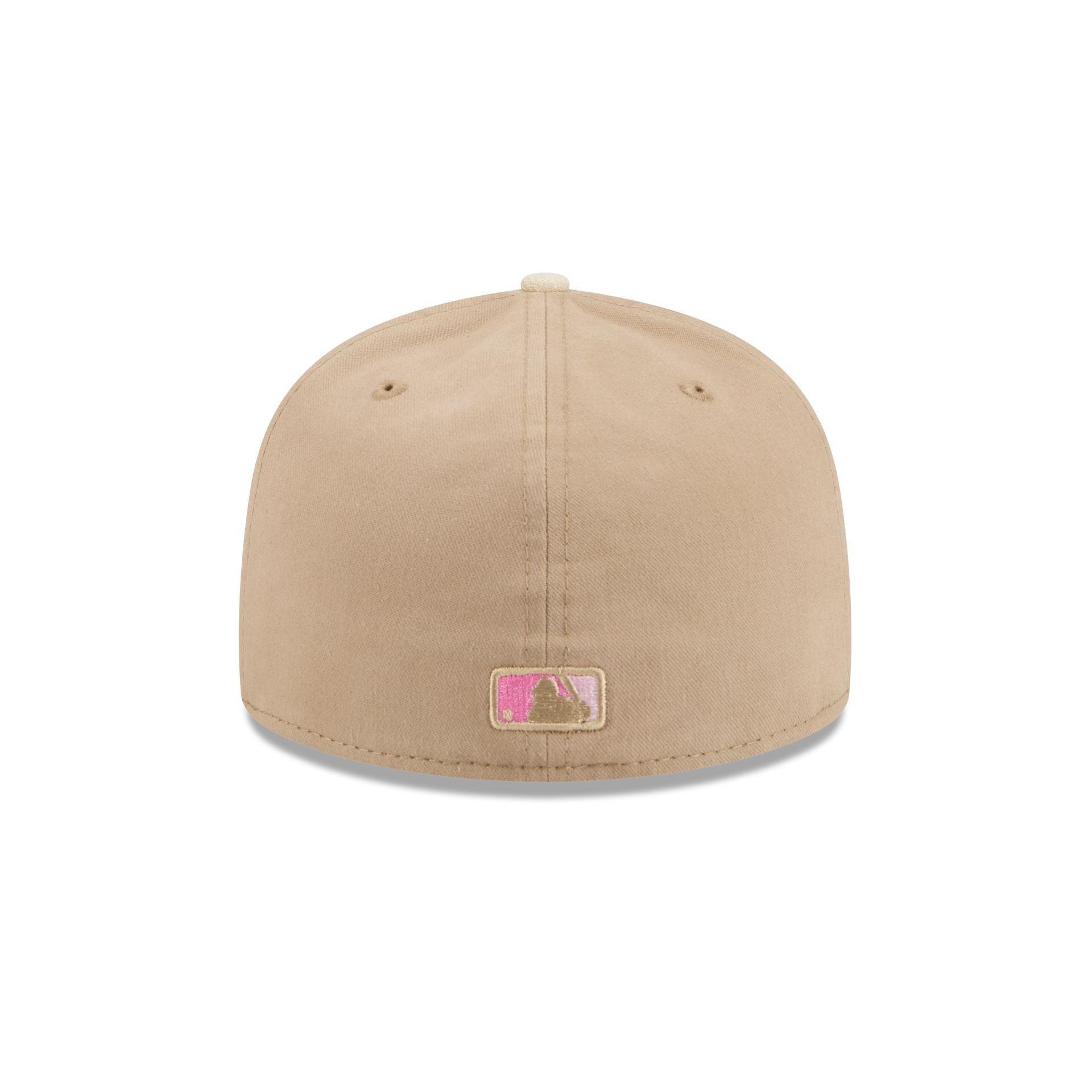 The Atlanta Braves Hand Stitched Floral 59FIFTY Fitted Cap features an embroidered Braves pink logo at the front panels with a matching MLB Batterman logo at the rear. Additional details include a flower embroidery at the visor and a gray undervisor.