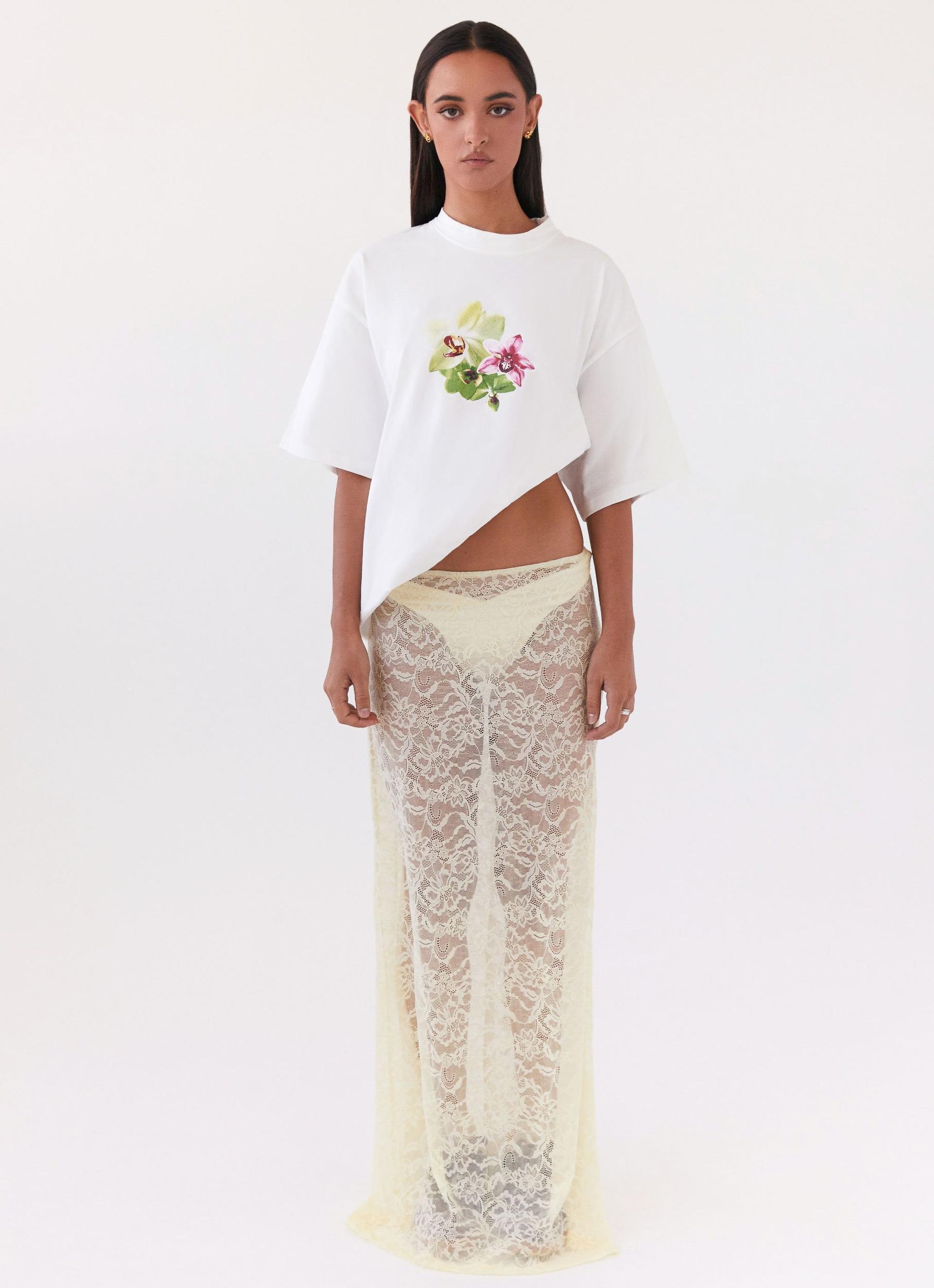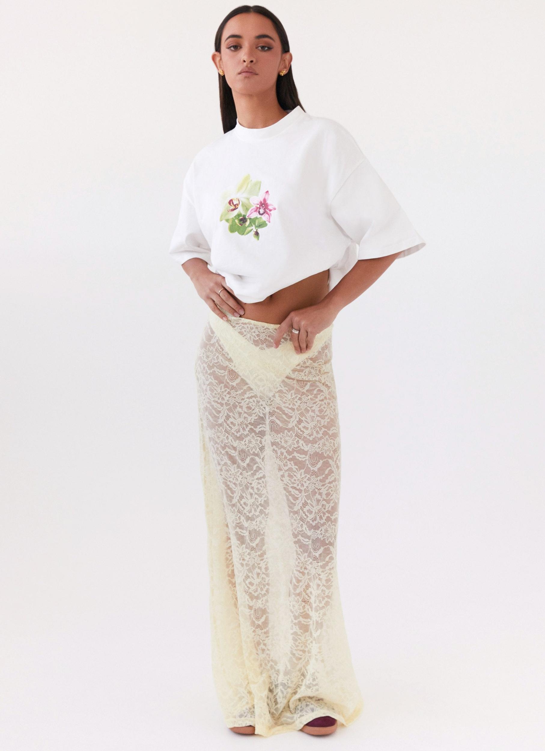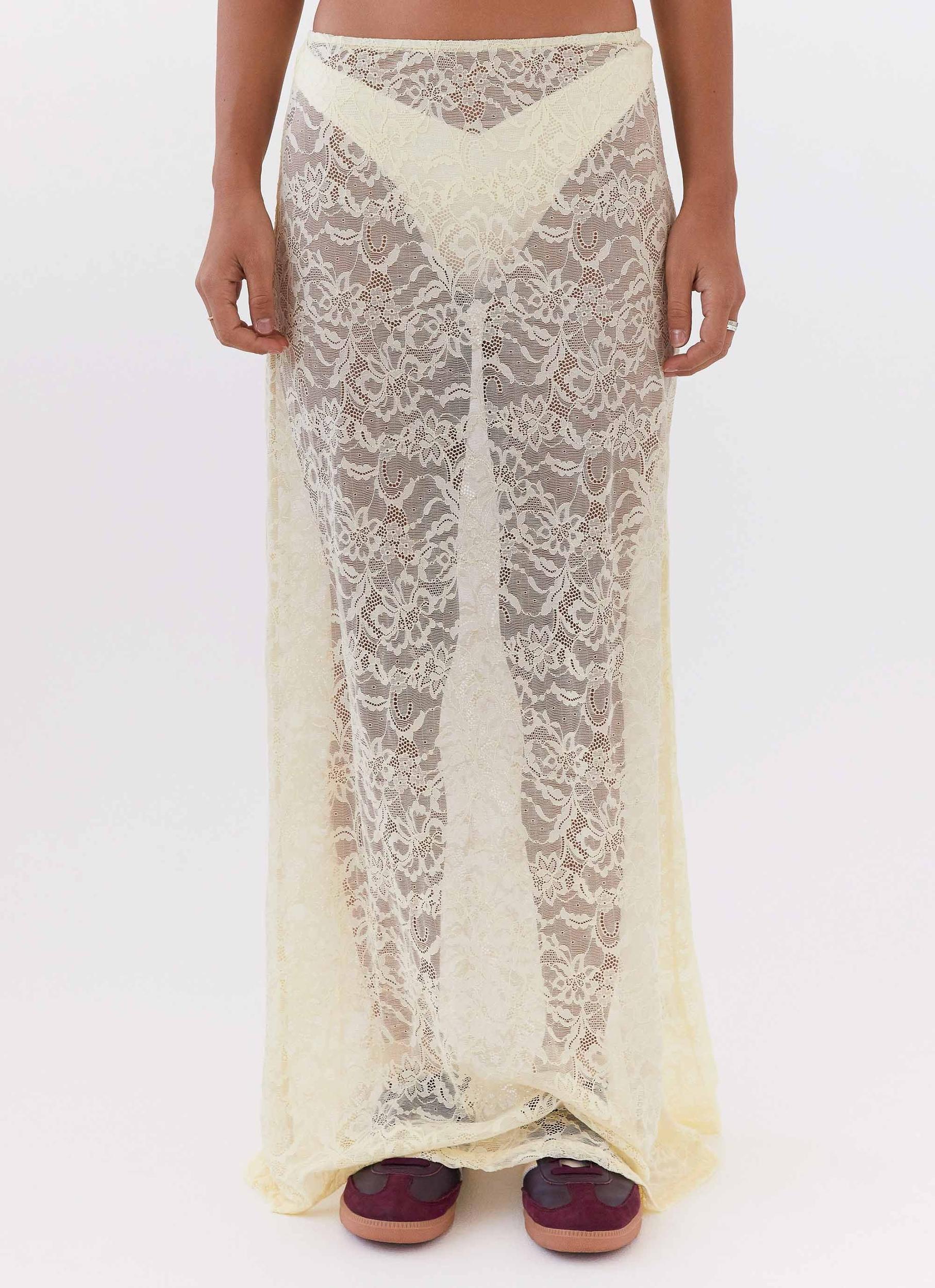 Peppermayo Exclusive Introducing the Atoir Lace Maxi Skirt. Crafted from sheer, stretch lace with a low-rise silhouette, this skirt combines delicate beauty with a flattering fit. Ideal for pairing with a variety of tops, it adds a touch of romance to any ensemble - Maxi length- Low rise- Stretch lace- Sheer- Elastic waist- 95% Polyamide, 5% Elastane Size AU 8 / US 4 garment measurements: Waist: 70cm / 27.6 inHip: 96cm / 37.8 inHem: 154cm / 60.6 inLength: 105cm / 41.3 in Roberta is 177cm and wears size AU 6 / size US 2