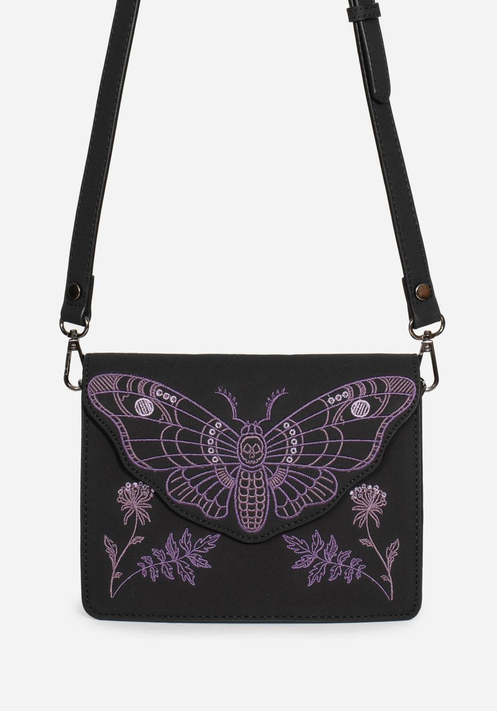 Like a moth to a flame...- Black & purple moth embroidered mini crossbody bag - Dainty size holds essentials for easy access - Sturdy box shape stays structured - Front flap fastens with a magnetic snap closure - Removable self-fabric shoulder strap for crossbody-to-clutch conversion - One internal pouch & one zipped pocket - Matte faux leather fabrication - Purple floral death moth embroidery on front - Sling over your shoulder & forge a new life 100% PU leather