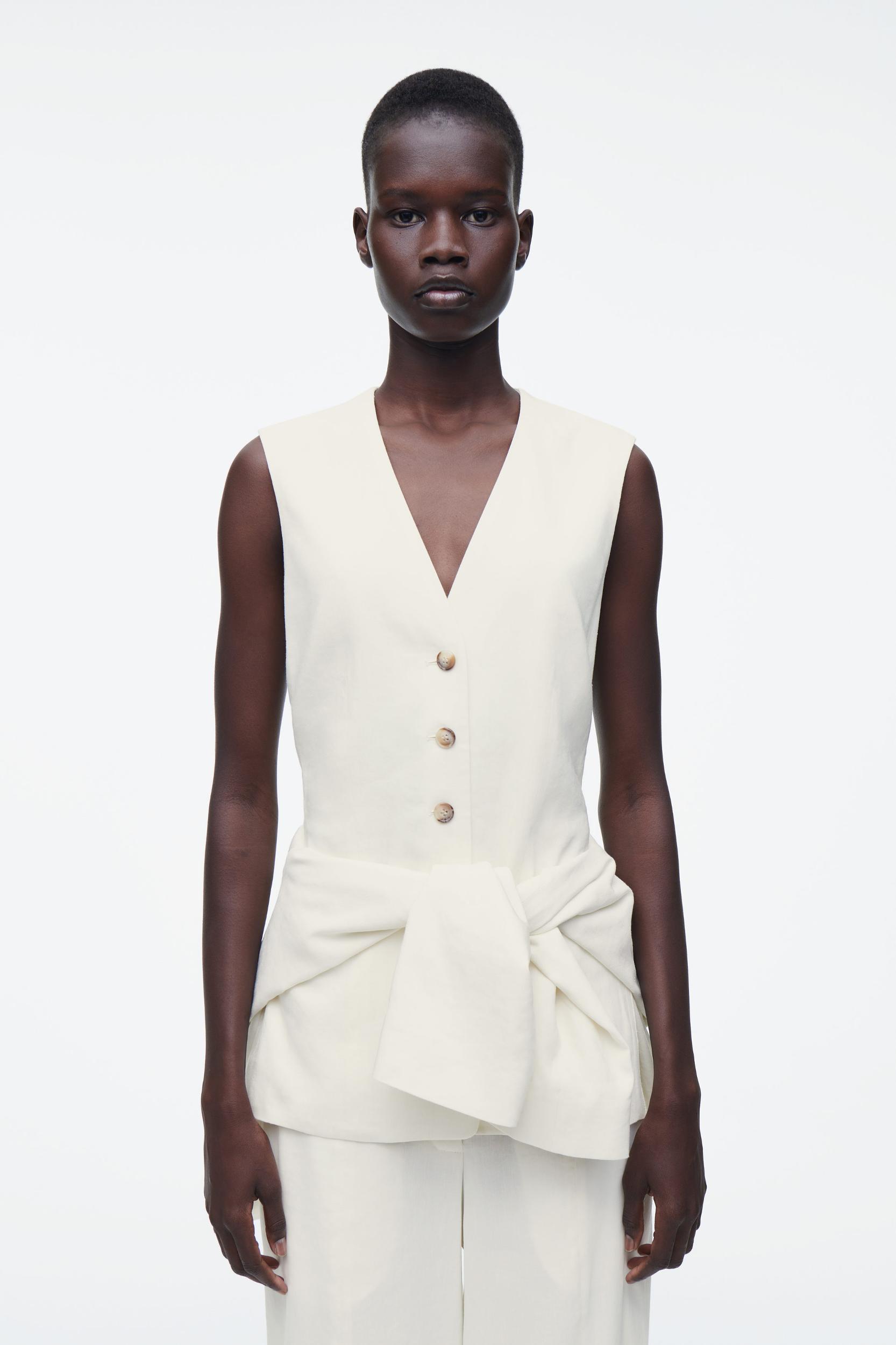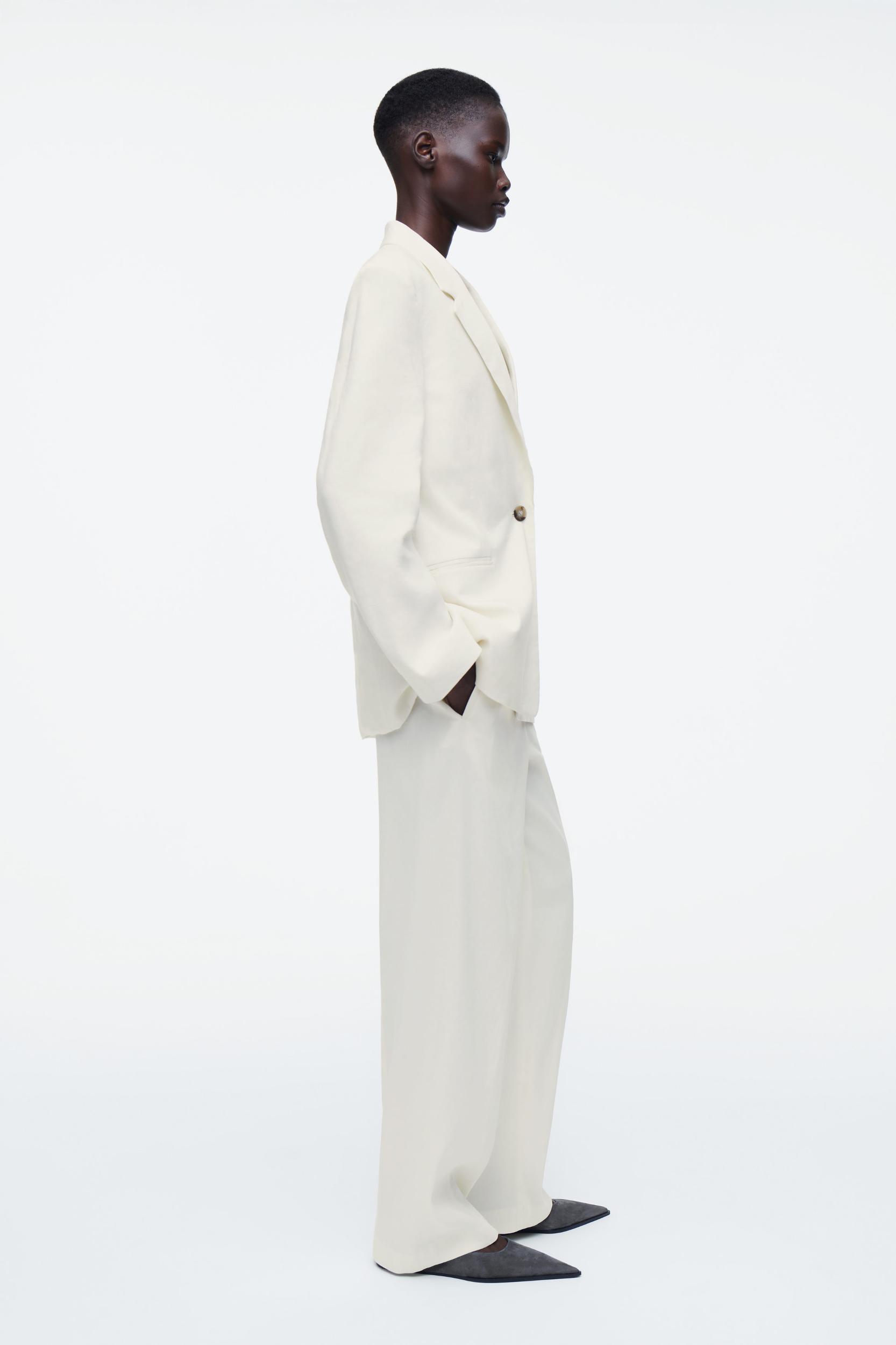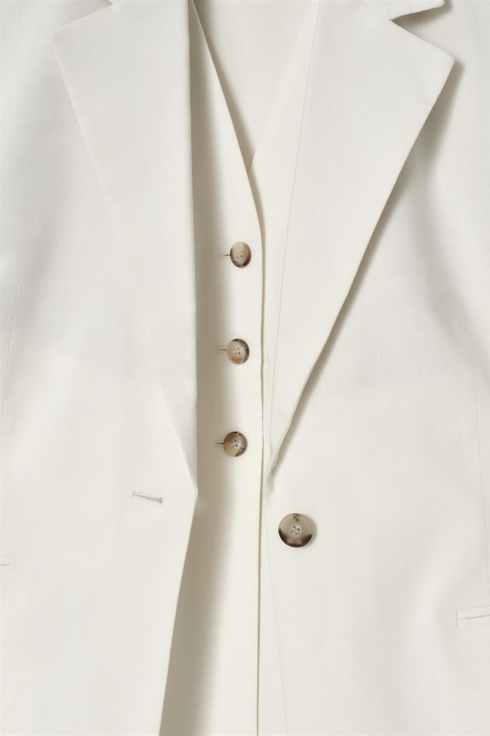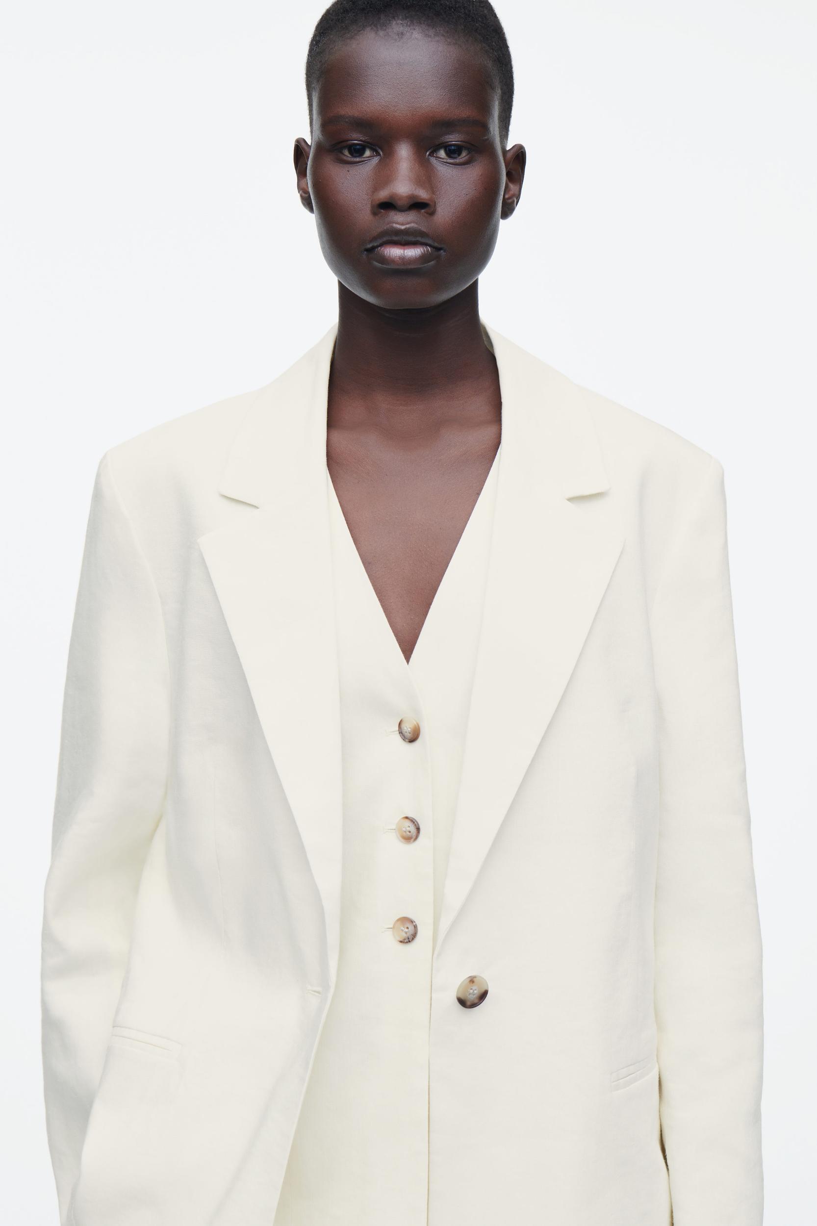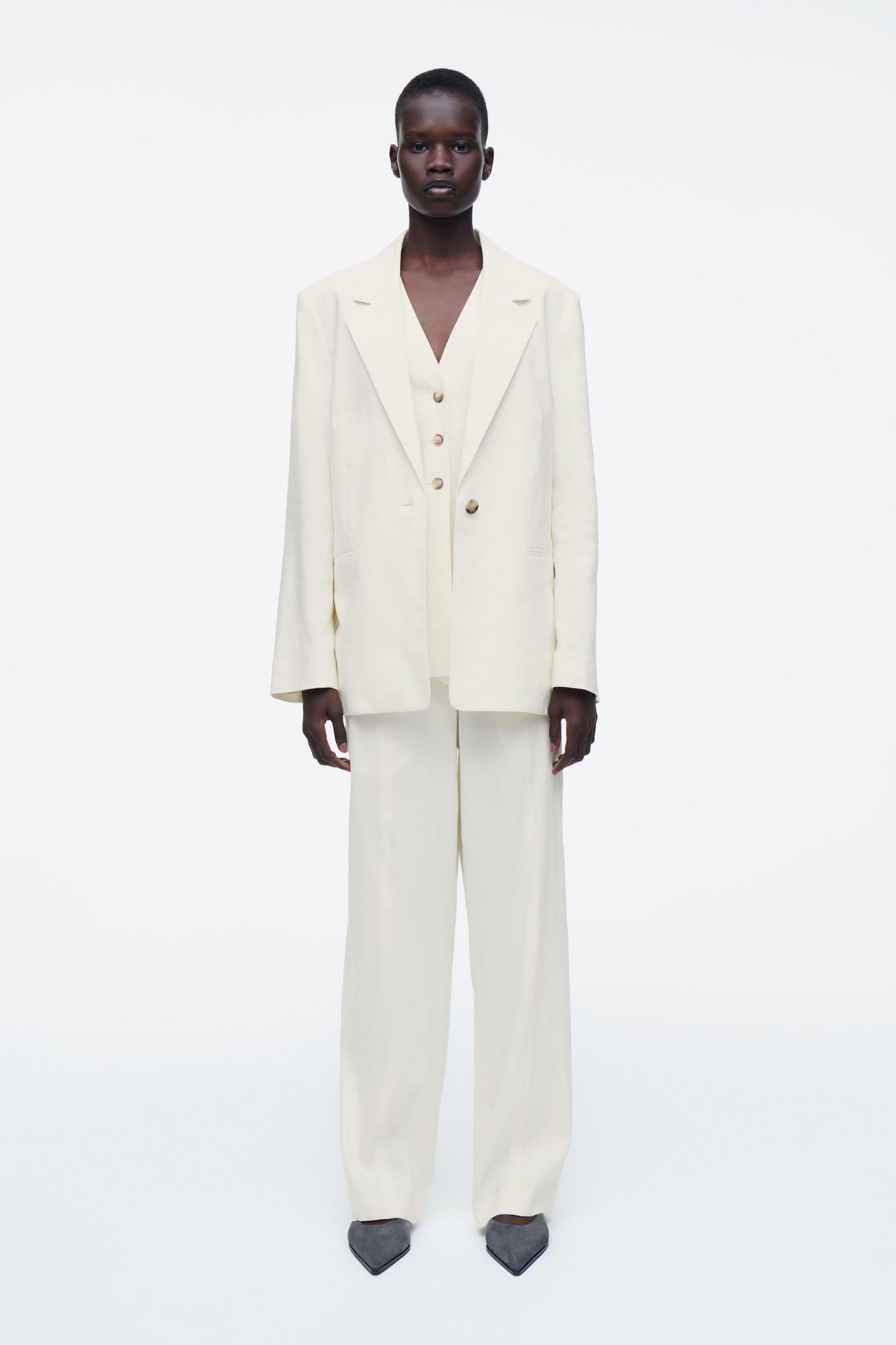 The COS SS25 runway collection builds on the house codes of lasting design and exceptional craftsmanship. Modular suiting plays a key role in the capsule: this layered piece comprises a single-breasted blazer and integral vest, each made from a premium European Flax™ cloth and cut in a relaxed silhouette. Style it with the blazer tied around the waist, finishing the look with the matching skirt or pants. Relaxed fitButton closureGrosgrain hanger loopEuropean Flax™ linen is a premium quality flax fiber, grown without the use of irrigation, other than in exceptional circumstances, or genetically modified seeds Shell: 60% European Flax™, 38% Viscose, 2% Elastane. Lining: 100% NAIA™ cellulose acetate. Excluding trims / Dry clean Back length of size 6 is 28.74” / Model wears a size 6