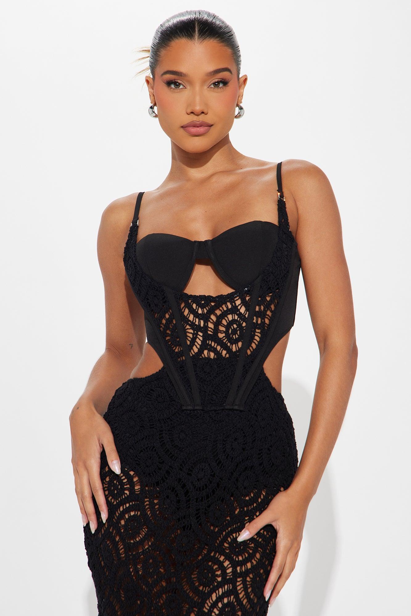 Available In White And Black. Crochet Maxi Dress Adjustable Spaghetti Straps Sweetheart Neckline Padded Bra Cups, Underbust Wire Corset Waist Cut Out Slit Zipper Closures Lined, Snap Button Closure Stretch Final Sale Self/Lining: 100% Polyester Contrast: 95% Polyester 5% Spandex Imported