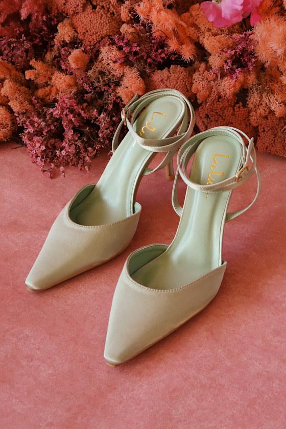Step out feeling particularly perfect whenever you style the Lulus Auberron Sage Satin Ankle Strap Pumps! Chic satin shapes a pointed-toe upper with a low-cut collar and matching straps that sprout from the sides to wrap and secure around the ankle with a silver buckle. A sultry stiletto heel completes the sleek design.