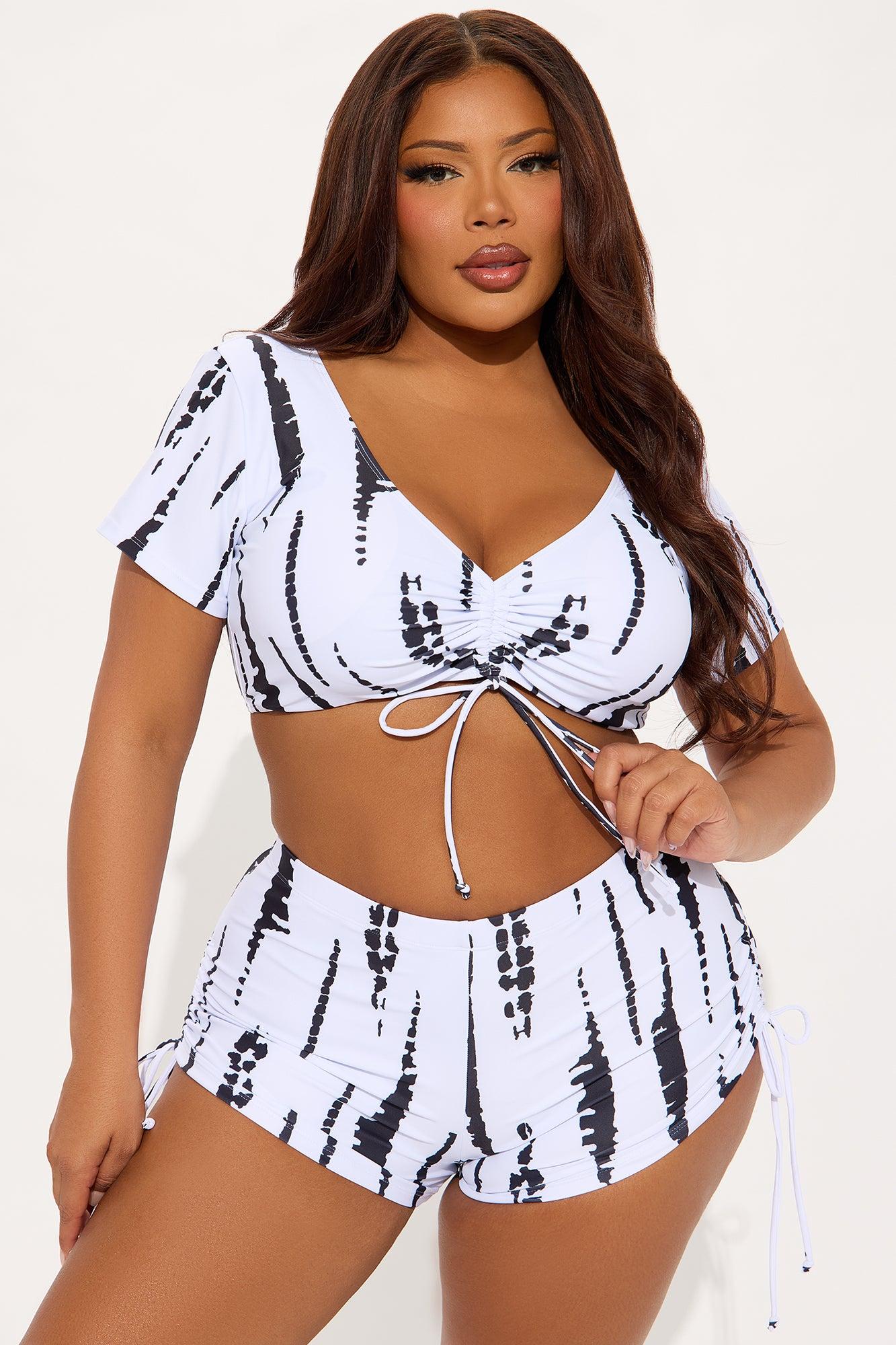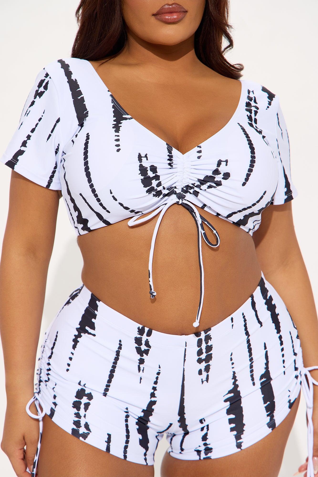 Available In White/Black. 2 Piece Bikini Tank Bikini Top Cropped Removable Cups Short Sleeves Adjustable Ruching Detail Boyshort Bikini Bottom Cheeky Full Stretch Final Sale Disclaimer: Print Placement May Vary. Shell/Lining: 88% Polyester 12% Spandex Imported California Proposition 65WARNING: Cancer and Reproductive Harm - www.P65Warnings.ca.gov.
