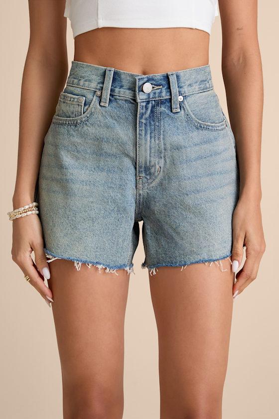 From June to September, these Just Black denim shorts will quickly become a part of your daily uniform. The iconic high-rise waist features belt loops, a top button closure with a hidden zip fly, and a classic five-pocket cut. Whiskering and fading accent the A-line silhouette that finishes with raw, cutoff hems for an authentic vibe.