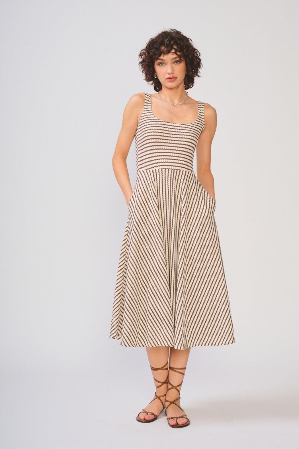 The perfect blend of comfort and style, the Audrey fit and flare tank dress was designed to flatter every figure. The bias-cut midi-length skirt creates a graceful flow, while the textured Mocha Cream stripe knit adds a touch of sophistication. With the added convenience of side pockets, this dress is as practical as it is chic. Ideal for casual outings or dressed-up occasions, this versatile piece will quickly become a staple in your wardrobe.
