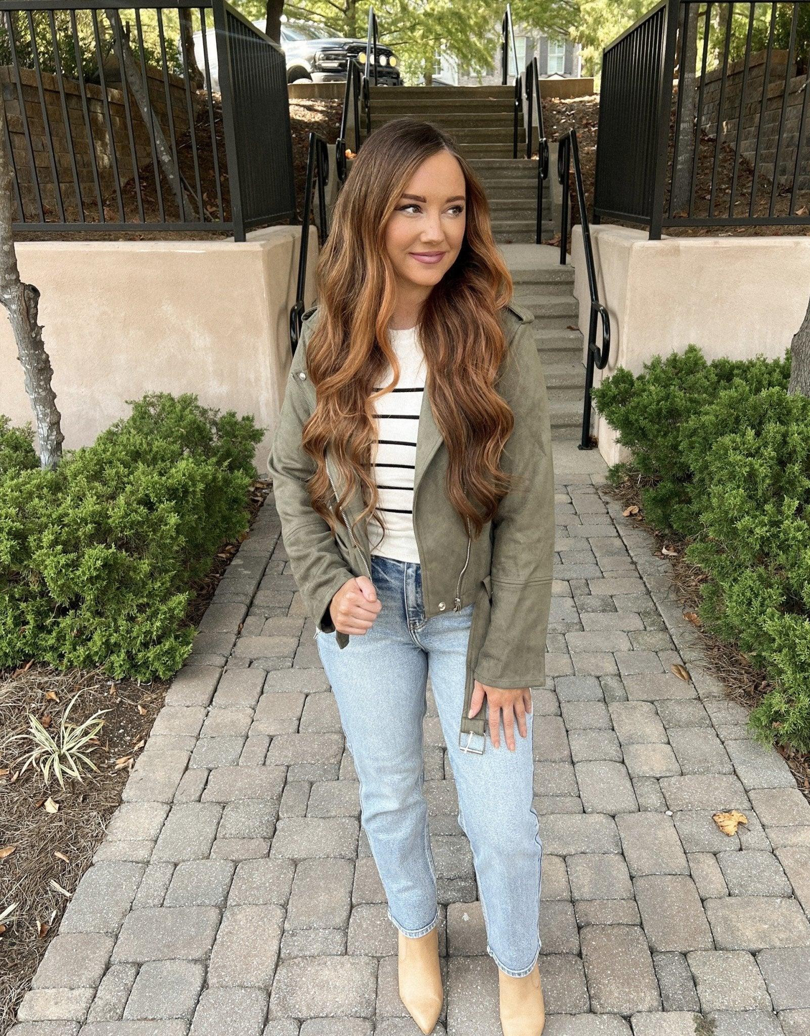 Magnolia Exclusive! Give your look a suede finish with an edgy Magnolia Exclusive style, the Audrey Olive Green Vegan Suede Moto Jacket! This faux suede moto jacket features silver nailhead detailing with an asymmetrical front zipper closure, an oversized notched collar and epaluts, zippered hand pockets and a snap coin pocket, and a cropped straight hemline with an exaggerated belt. Style this jacket over a essential basic bodysuit or tee, denim, and a pair of western booties to up your look's ante with a pop of color!
