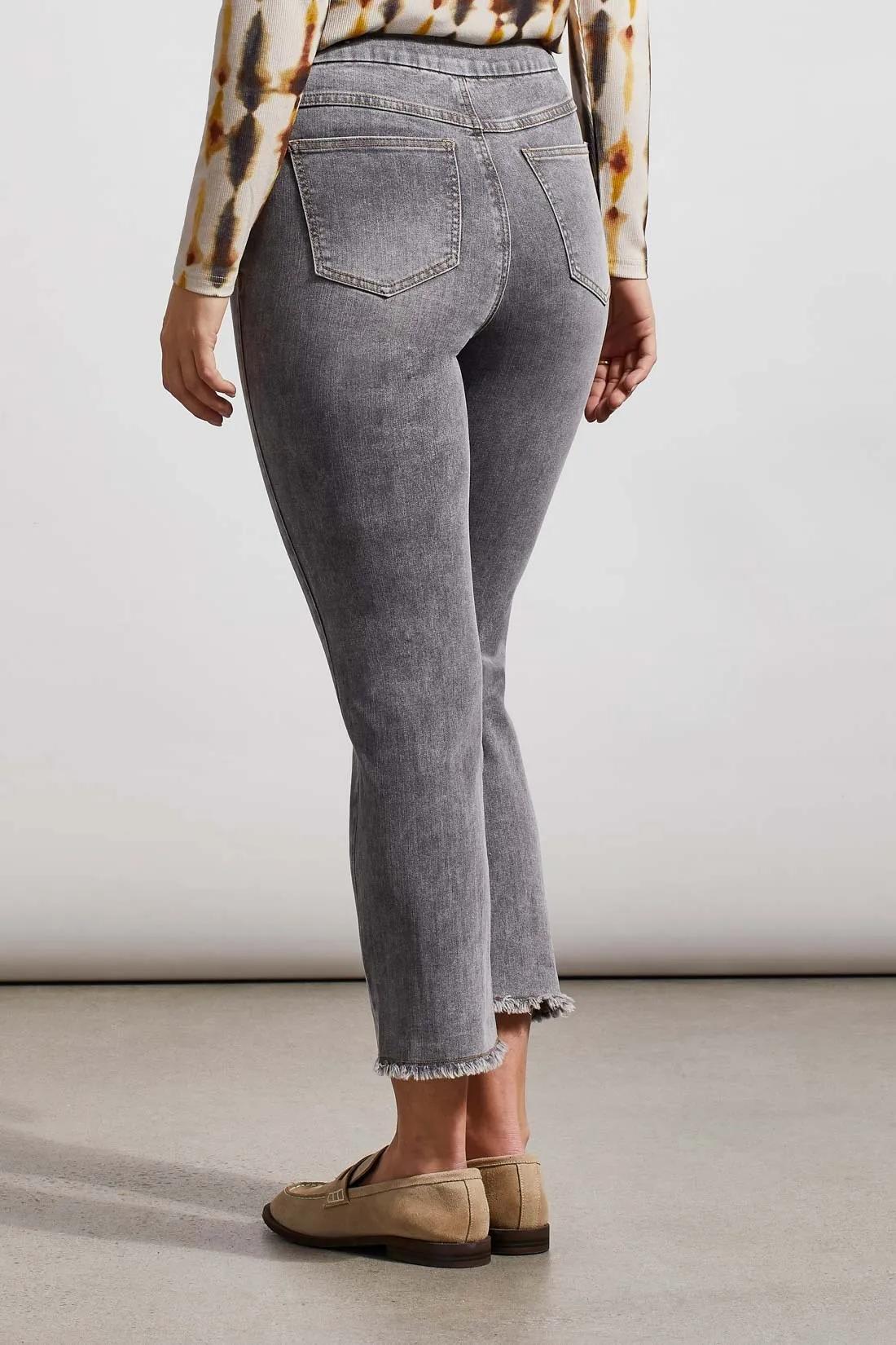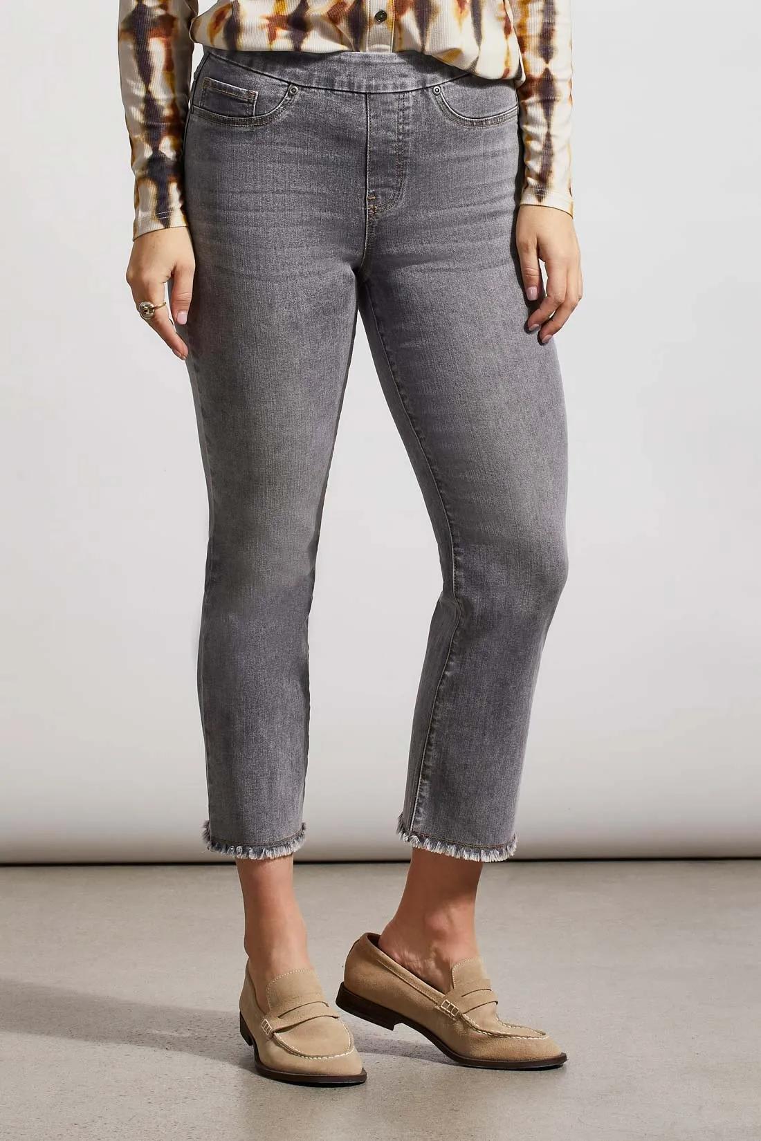 Tribal's essential mid-rise straight jeans gives your behind the perfect lift. The thoughtfully designed jean is slim-fitting through the hip, butt and thigh with a straight leg. A frayed hem to finish provides a fresh twist on the classic. Pull on waist Mid rise size 8 has a 10 1/4" rise 26" length Straight leg Tummy control panel