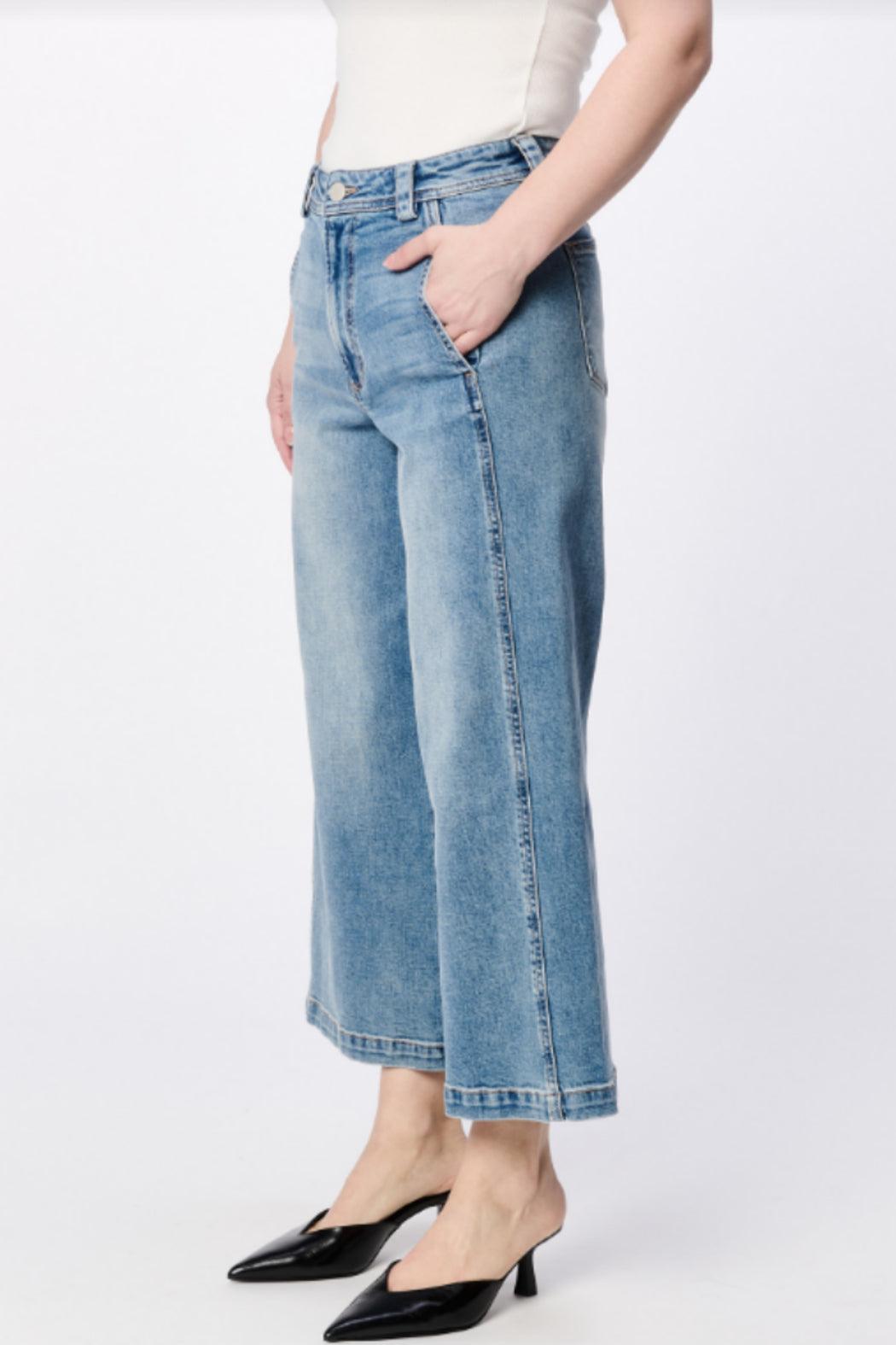 The perfect blend of modern women's fashion and comfortable with our Audrey wide leg jeans in Surfwind, featuring a flattering high-rise fit, a chic drop clean hem and form lifting back dart.