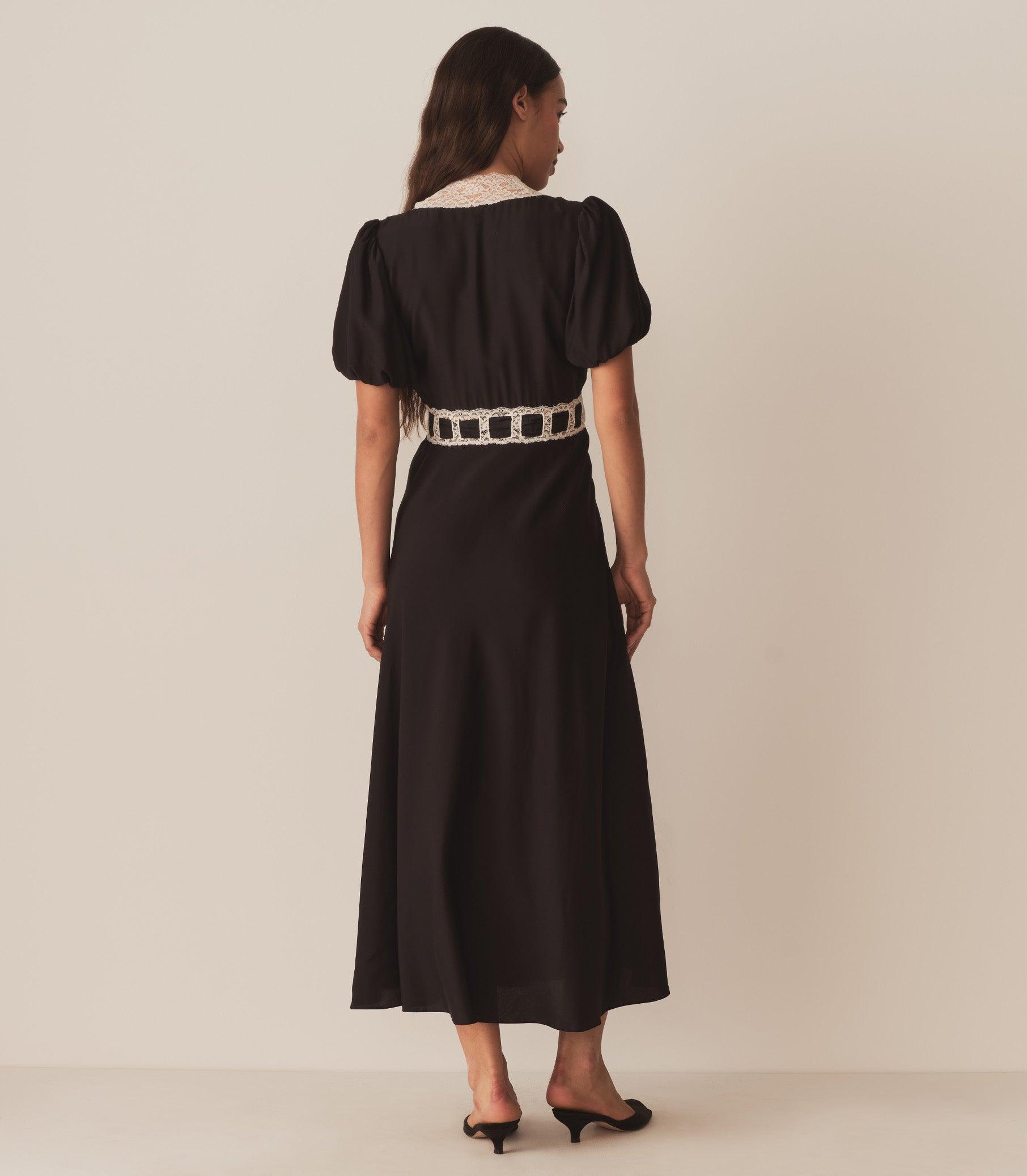Crafted from a lightweight silk-viscose blend, the boudoir-inspired Augustina Dress features short puffed sleeves and a deep V-neckline trimmed with intricate lace. Threaded with a silk ribbon, a gathered bust and angled waist with an invisible side zipper gives way to an ankle-grazing, bias-cut skirt.