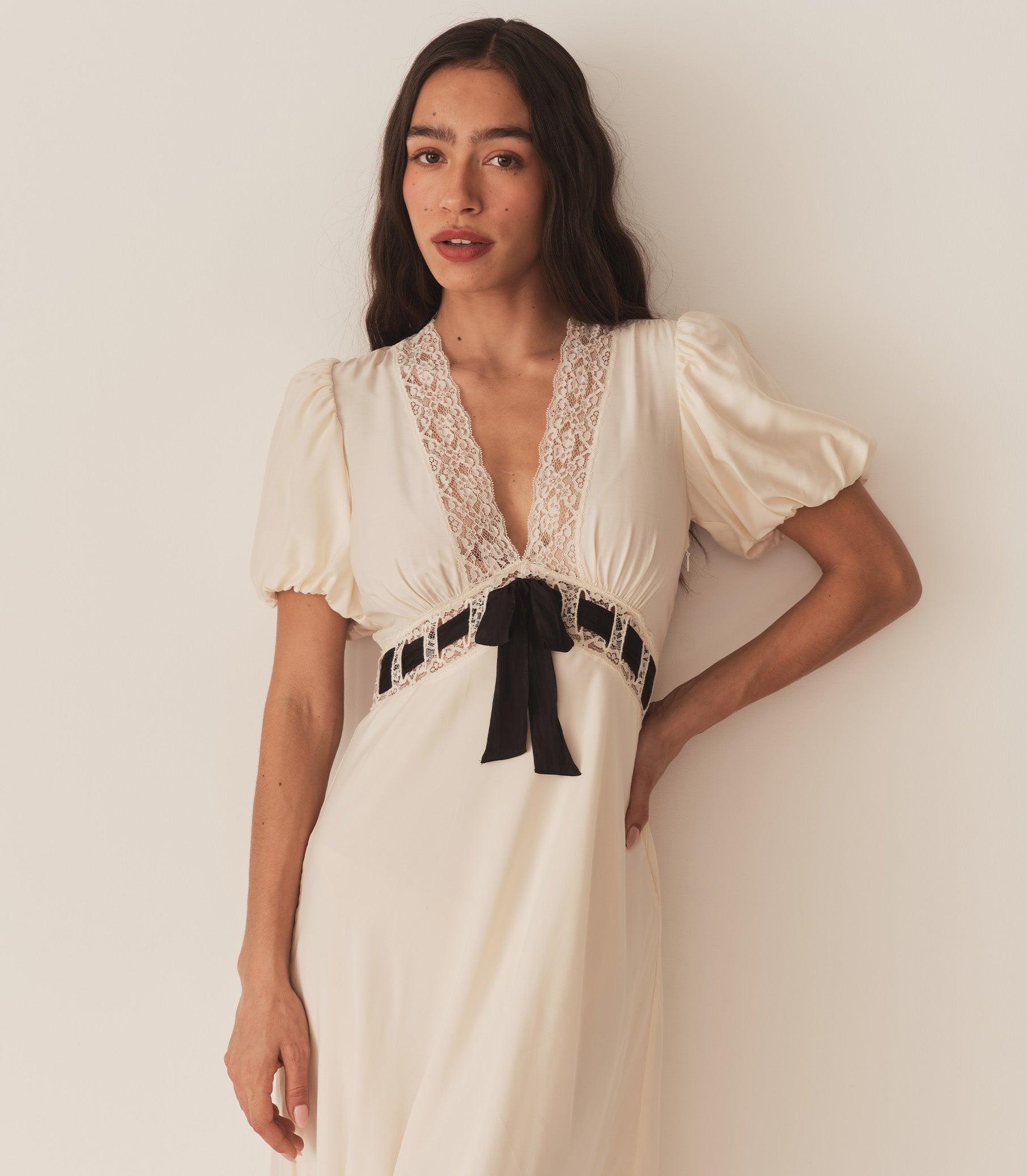 Crafted from a lightweight silk-viscose blend, the boudoir-inspired Augustina Dress features short puffed sleeves and a deep V-neckline trimmed with intricate lace. Threaded with a silk ribbon, a gathered bust and angled waist with an invisible side zipper gives way to an ankle-grazing, bias-cut skirt.