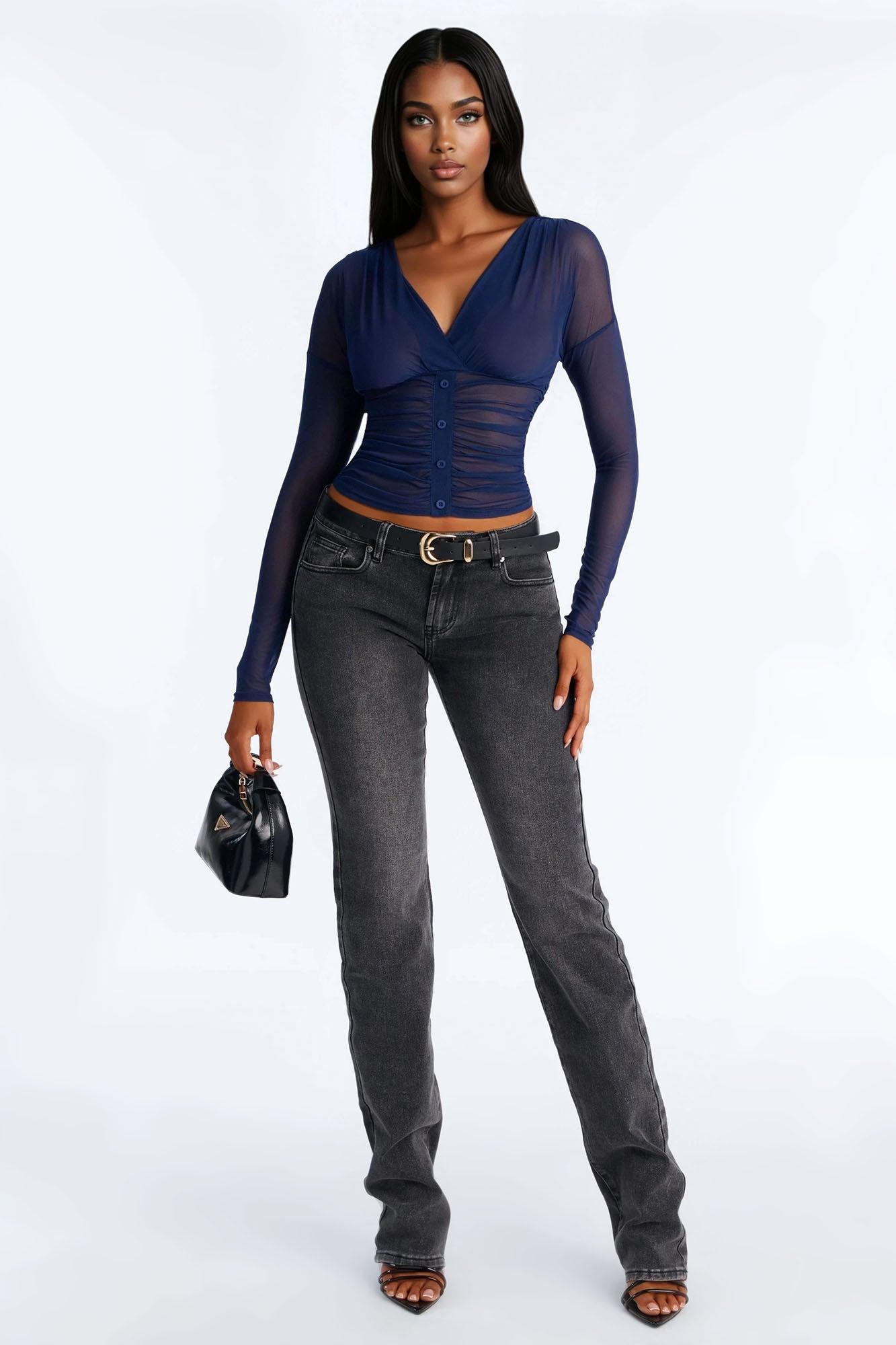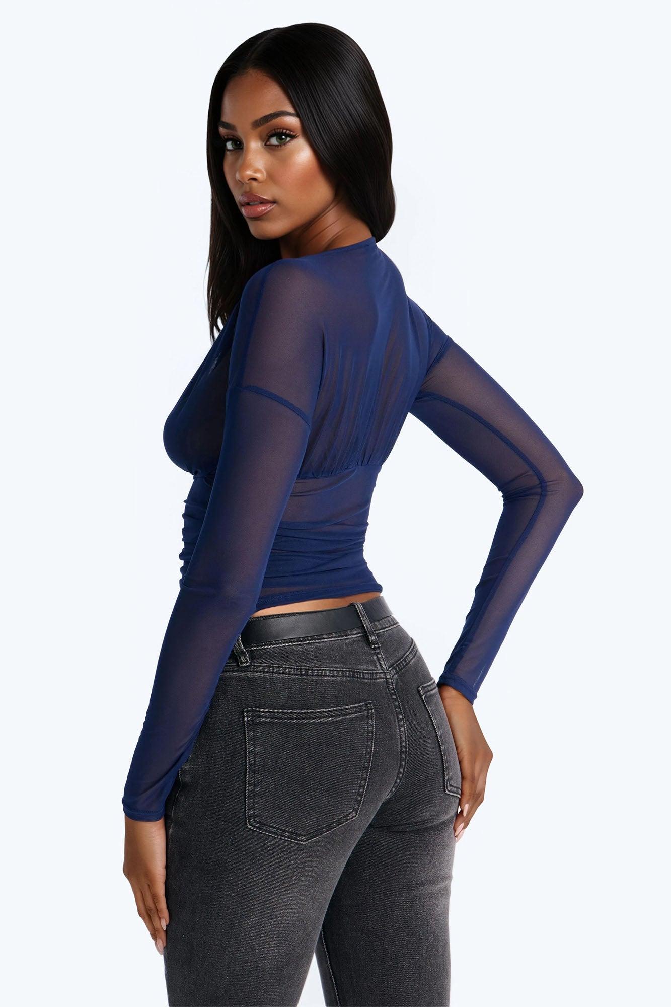 Aurelie Ruched Sheer Mesh Button Up Top - Navy Female