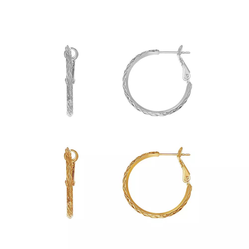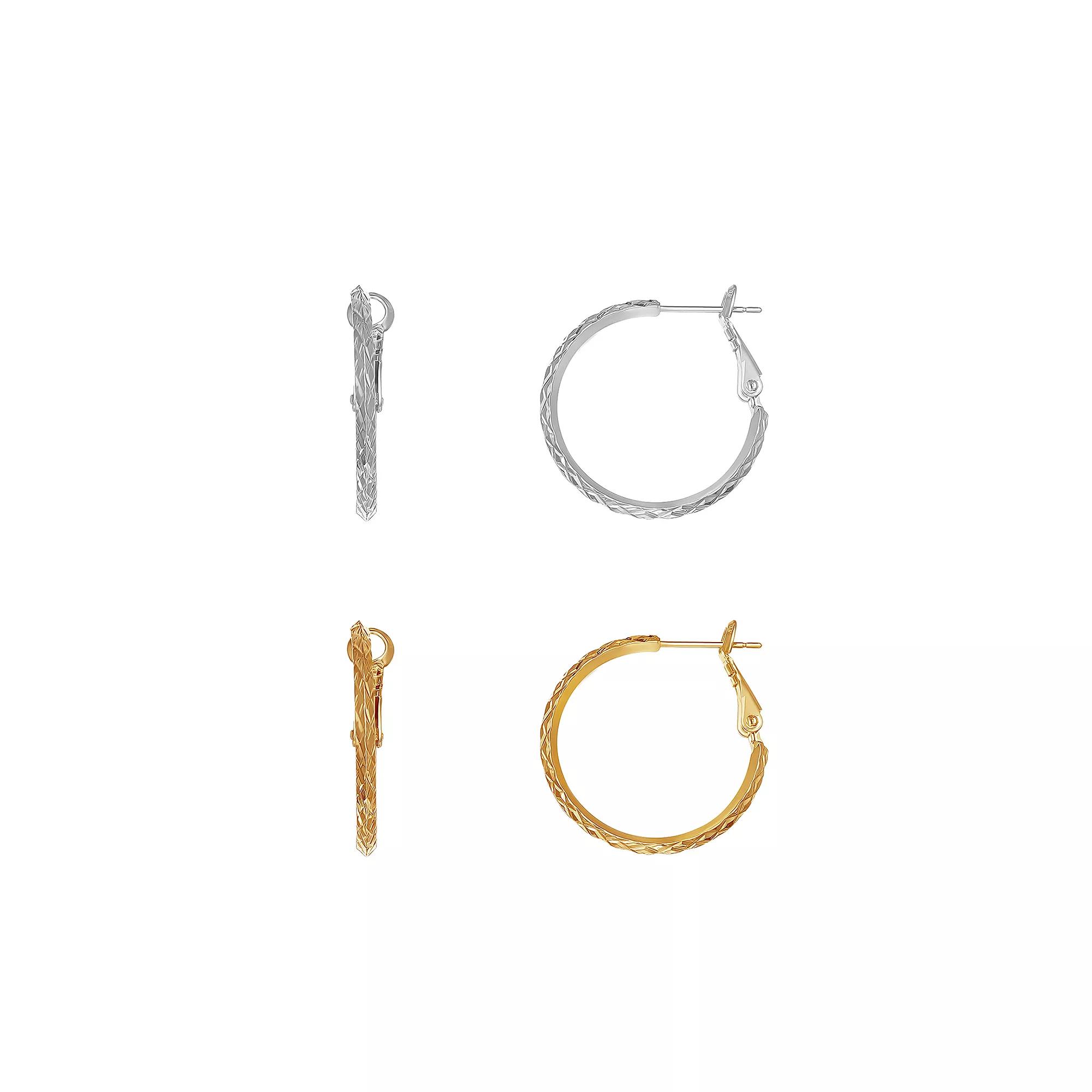 You'll have the perfect pair for any occasion with this Aurielle hoop earring set. Backings: paddle back Includes: 2 pairs of earrings Nickel free Metal: brass Plating: 18k gold flash plated, silver tone Packaging: boxed Finish: diamond-cut Diameter: 30 mm (each) Size: One Size. Color: Multicolor. Gender: female. Age Group: adult.