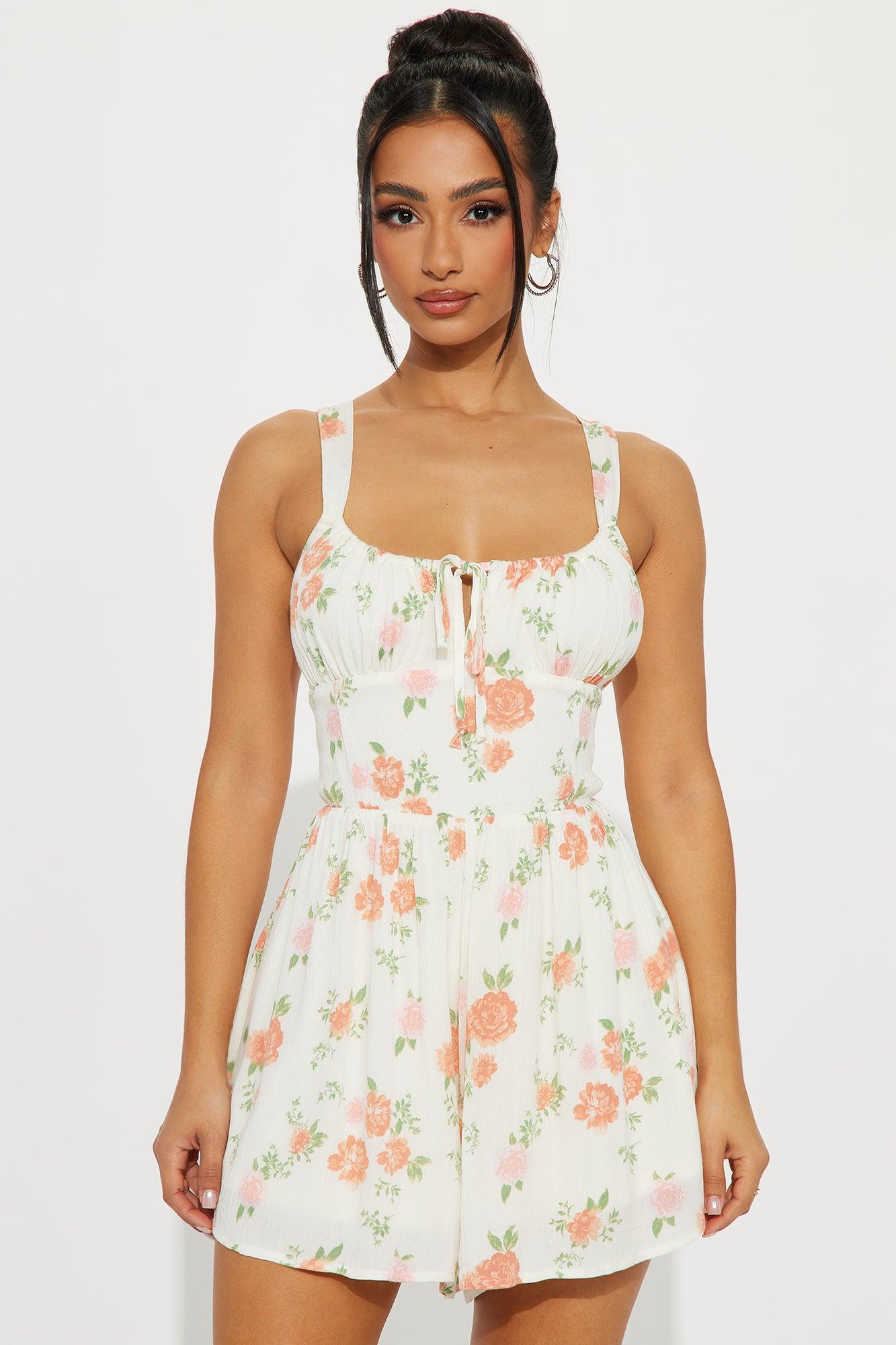 Available In Cream/combo. Romper Adjustable Straps Tie Front Lace Up Back Flowy Short Lined Non Stretch Disclaimer: Due To The Printing Process A Difference In Saturation May Occur. Each Garment Is Unique. Body: 100% Rayon Lining: 100% Polyester Imported