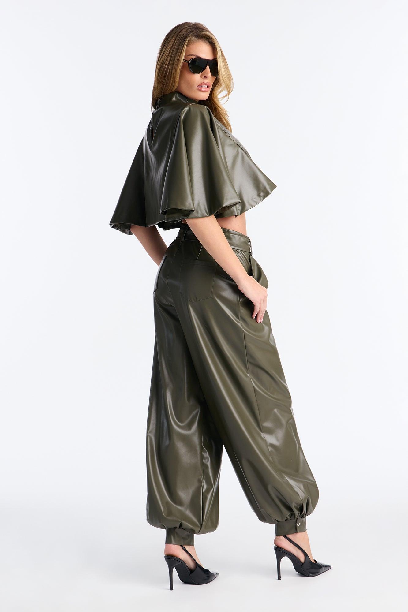 Available In Olive. 2 Piece Ensemble Blouse And Pant Set Stretch Lined Belted Jogger Leg 31" Inseam Top & Bottom Self: 55% Polyurethane 45% Polyester Top & Bottom Lining: 100% Polyester Imported California Proposition 65WARNING: Cancer and Reproductive Harm - www.P65Warnings.ca.gov.