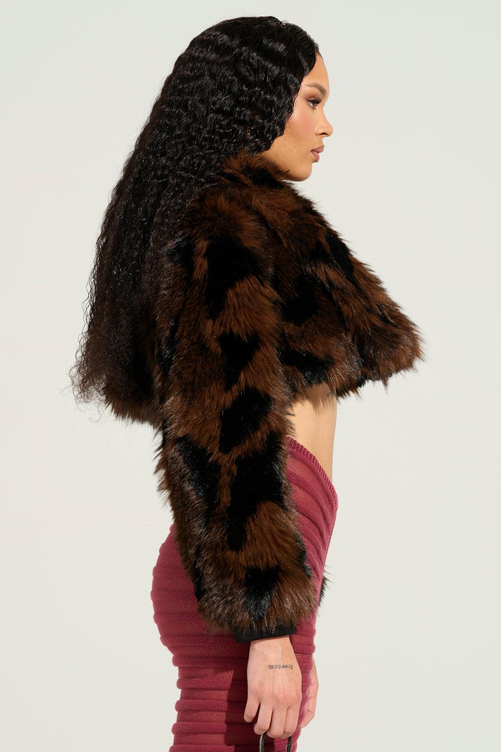 Winter fashion has never looked so good. The AKIRA Label Austin Cropped Faux Fur Jacket is crafted from a lush, non-stretch faux fur base and features a cross-front fur lapel collar, long sleeves with ribbed knit cinched cuffs, a sleek inner lining, and a single snap-hinge closure at the bottom hem. Complete with a boxy, cropped silhouette. Pair with satin trousers and heeled booties for a chic, chilly day ensemble. - Faux Fur Shell: 100% Polyester, Lining: 100% Polyester- Dry Clean Only- No Stretch- Imported (all measurements approximate from size small)- 11” Shoulder to Hem- 22” Sleeves- 17” Shoulder to Shoulder- Model is 5’11” and is wearing size smallProduct ID: 465550 (all measurements approximate from size 1X)- 13” Shoulder to Hem- 24” Sleeves- 19” Shoulder to ShoulderProduct ID: 465554