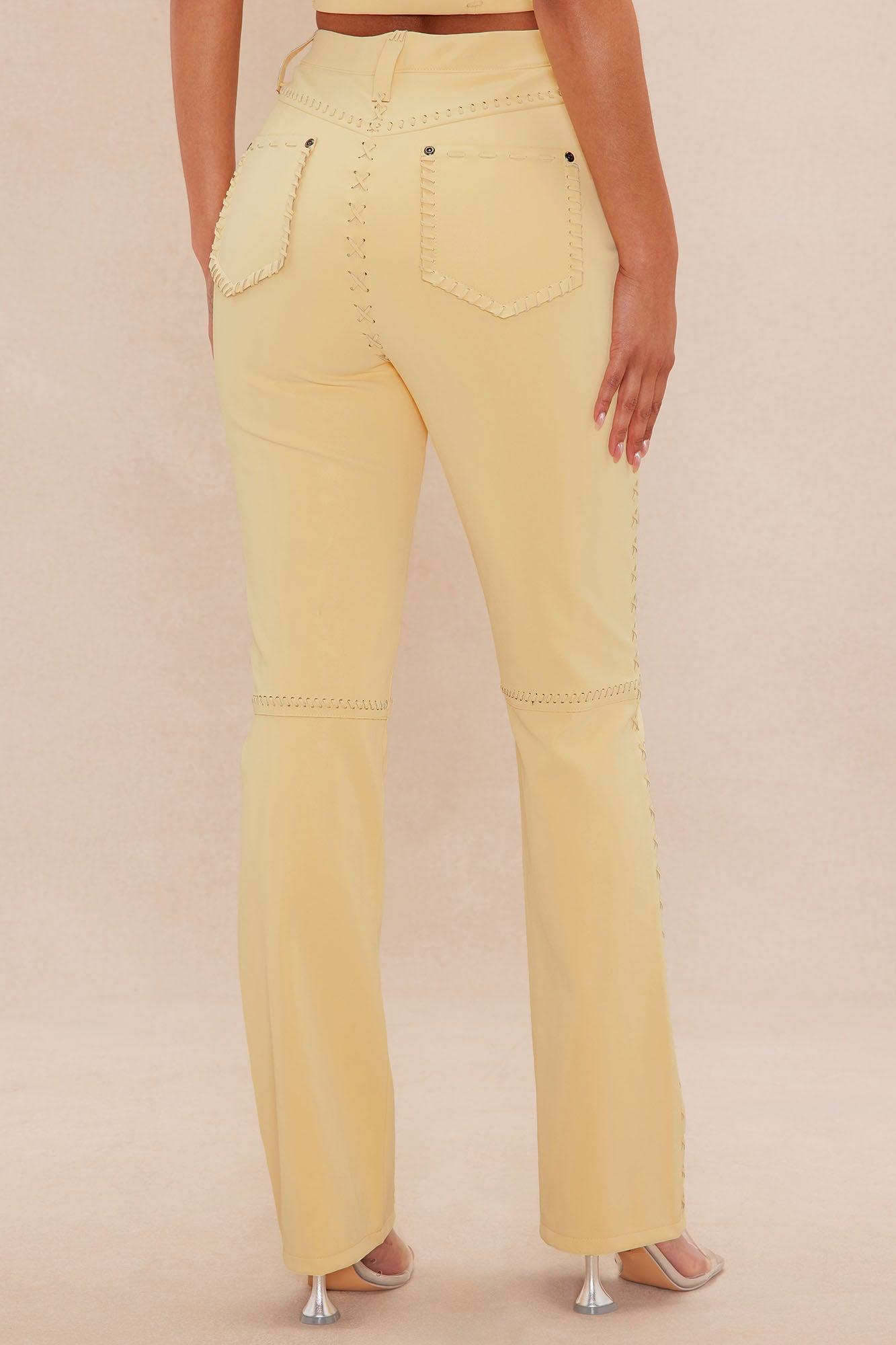 Available In White And Yellow. Faux Leather Pant Belt Loops Pockets Seam Detail Lace Up Closure Non Stretch Inseam= 33'' Shell: 55% Polyester 45% Polyurethane Lining:97%Polyester 3%Spandex Imported California Proposition 65WARNING: Cancer and Reproductive Harm - www.P65Warnings.ca.gov.