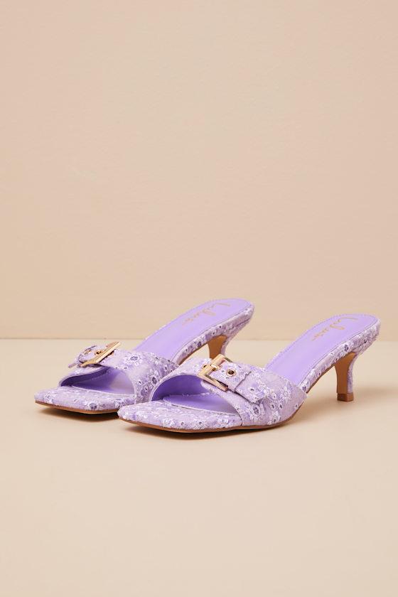 The Lulus Austina Purple Embroidered Buckle High Heel Slide Sandals are the epitome of spring style and are ready to be paired with so many sunny day looks! Eyelet-inspired embroidery details accent these adorable slide sandals that feature a trendy square footbed and a tapered, adjustable vamp strap that secures with a shiny gold buckle. A trendy kitten heel completes the darling design.