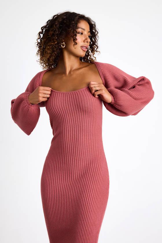 The Lulus Autumn Aura Rusty Rose Ribbed Two-Piece Sweater Dress is making us want to throw on our favorite booties and grab a pumpkin-spiced latte! This super cute sweater set is composed of stretchy ribbed knit that starts with a shrug-style cardigan with an open-front design and long balloon sleeves (with fitted cuffs) and an ultra-cropped hem. The matching bodycon dress boasts a sweetheart neckline and a strapless bodice that tops a figure-flaunting silhouette that finishes at a midi hem with a kick pleat at the back.