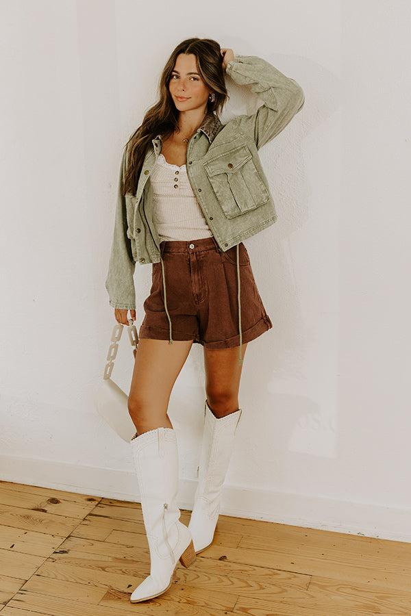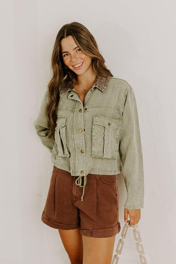 - Fall layers just got a stylish upgrade! This denim jacket brings effortless vibes with its drawstring hem and cool corduroy touches. - Unlined denim material with a vintage wash - A hazelnut colored corduroy collared neckline - Hidden zip closure as well as a button closure - Functional chest pockets - Long sleeves with a single snap at the cuff - A relaxed silhouette that ends in a straight hemline with a functional drawstring that ties in the front Measurements S : Bust 44", Hip 43", Length 20.5", Sleeve Length 22", Waist 44". M : Bust 46", Hip 45", Length 21", Sleeve Length 22.5", Waist 46". L : Bust 48", Hip 47", Length 21", Sleeve Length 23", Waist 48".