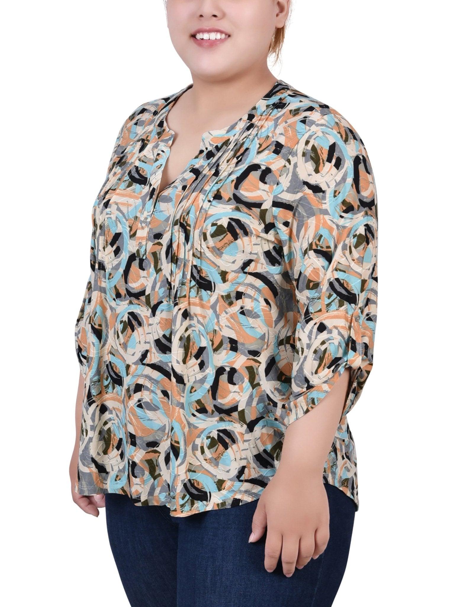 Autumn Blue Abstract 3/4 Roll Tap Pullover Top - Plus
