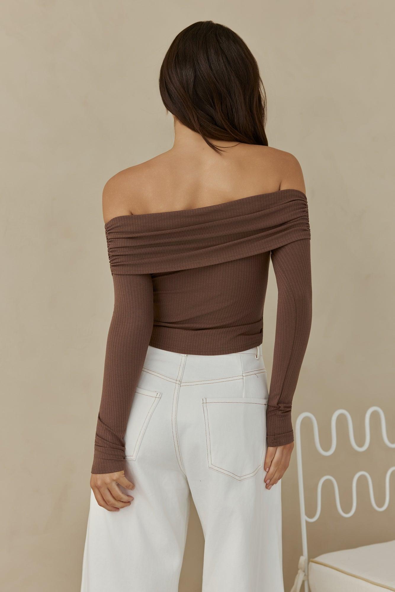 Soft, classic, and elegant, the Autumn Dreamer Long Sleeve Off Shoulder Top is the trans-seasonal piece that your wardrobe needs. A classic off-the-shoulder style, this top features a folded neckline with a layered detail at the front, and soft ribbed fabric. Pair with flowy pants and gold jewellery for an effortless look.