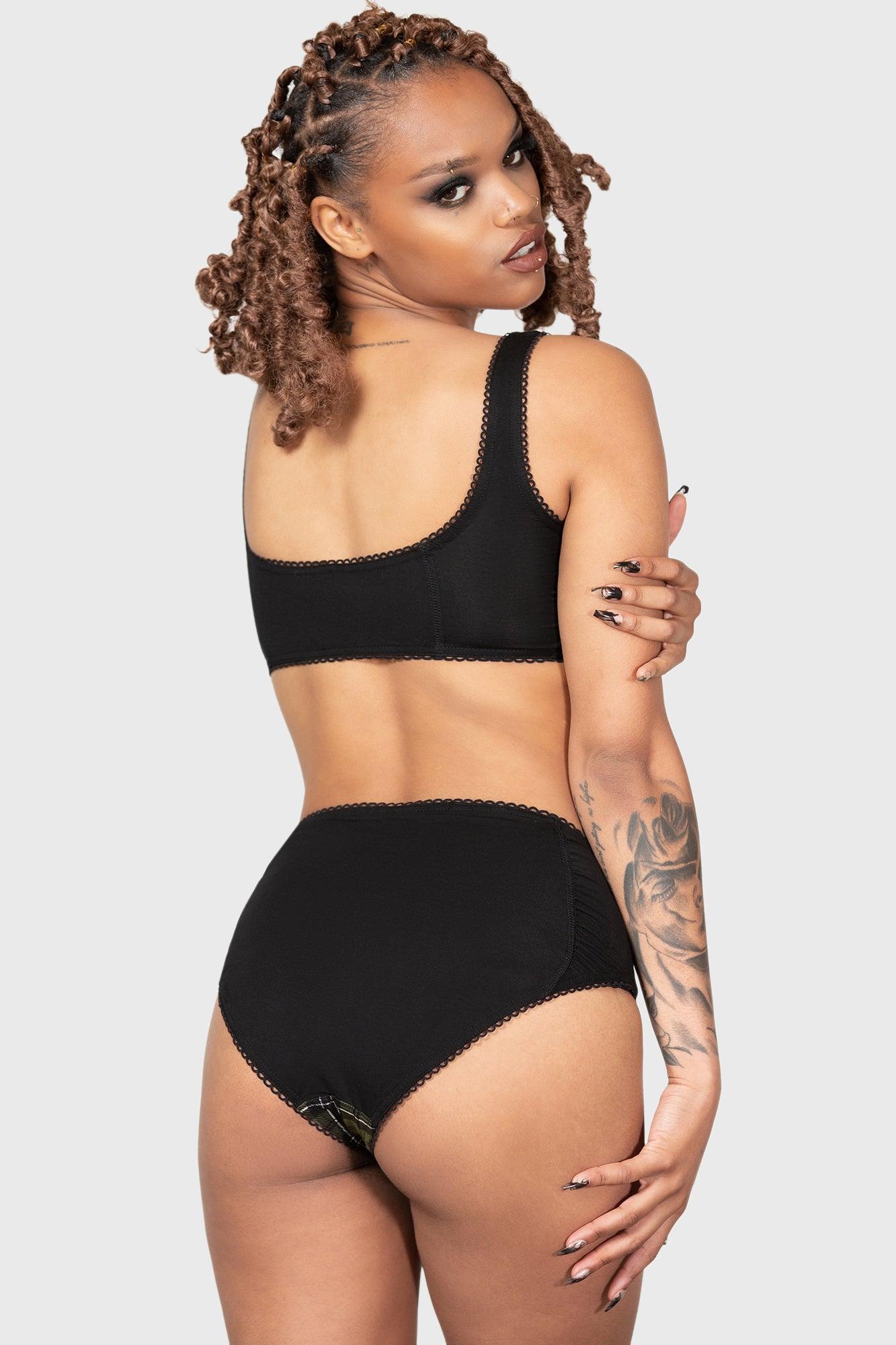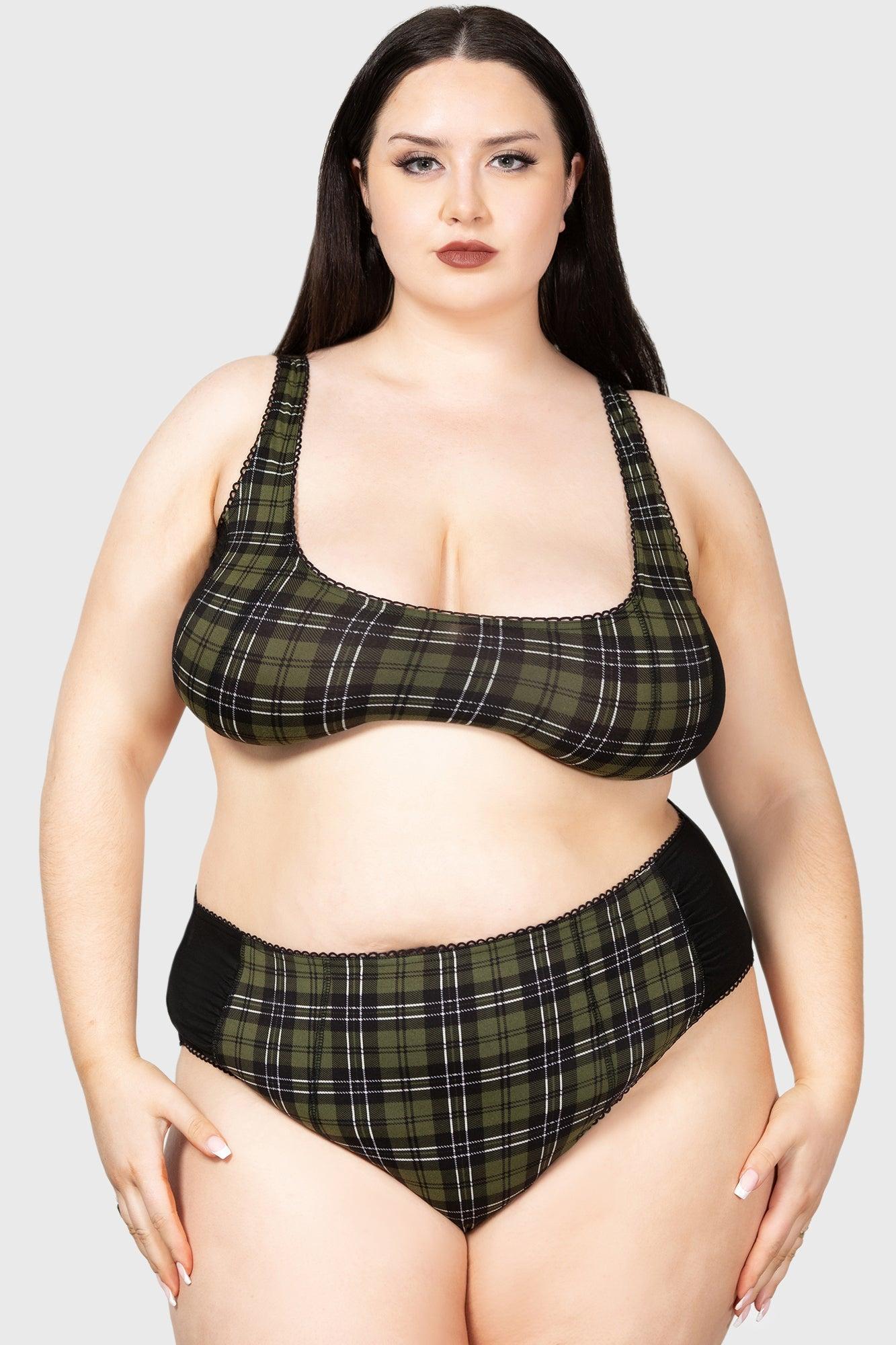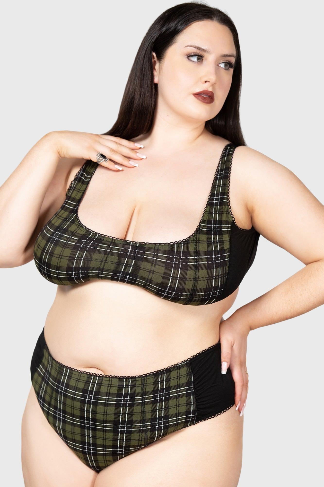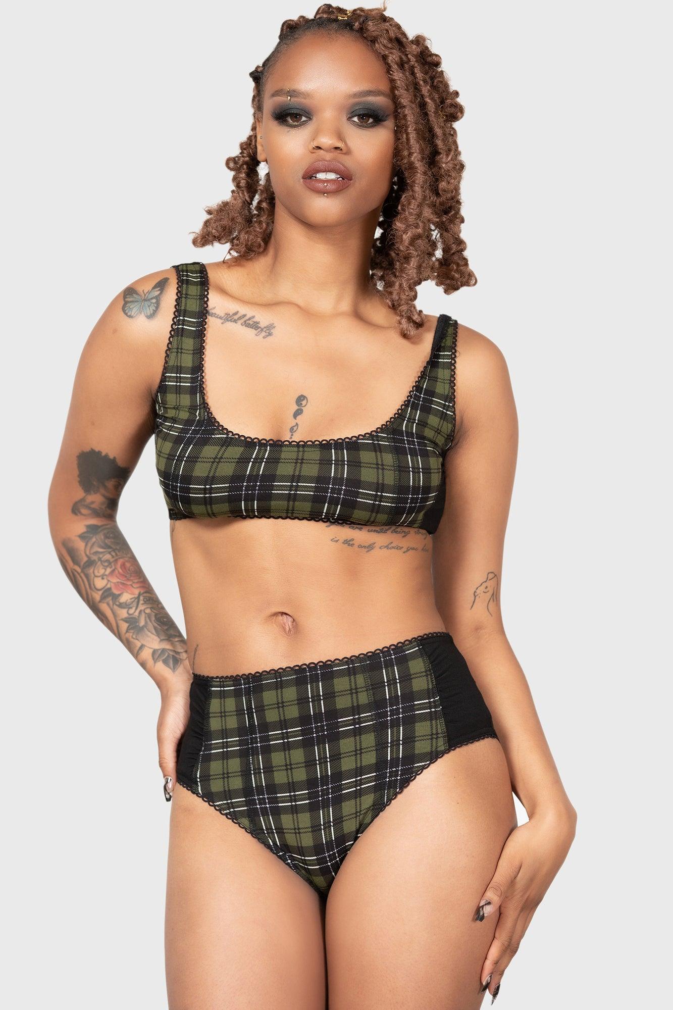 AUTUMN. - Soft, stretch fabric. - Statement green tartan with contrasting black reverse side. - Scalloped edge. - Fitted. With KILLSTAR branding, Fabric 1: 95% Viscose 5% Elastane, Fabric 2: 95% Viscose 5% Elastane. Hand wash delicate 30°c / Do not bleach / Do not tumble dry / Iron at low temperature / Do not dry clean. Imported.