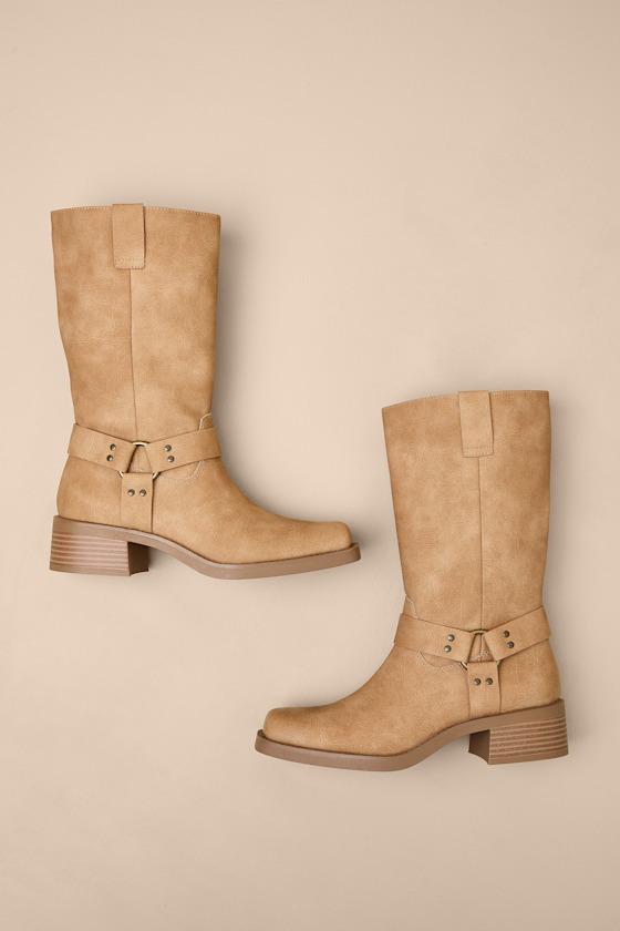 There's nothing we love more than romping around town in these coveted boots by Matisse, crafted with a smooth faux leather construction with a lived-in distressed effect. The sleek, squared upper leads to a seamed vamp and a mid-calf shaft with pull tabs on both sides for easy on-and-off styling. Matching studded straps come together at O-ring details to create a cool, moto-inspired look. Available in whole sizes only.