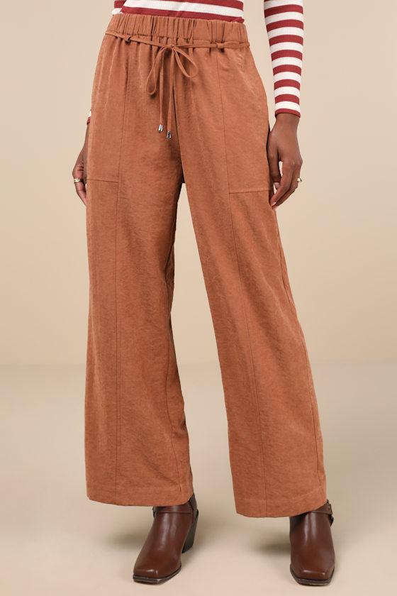 The Lulus Autumn Staple Brown Suede High Rise Wide-Leg Pants are here to keep your OOTDs cute as the season changes! Lightweight faux suede shapes these versatile pants that have a high, elastic waistband with mini belt loops and a threaded, tying belt with silver aglets. Functional pork chop pockets and back patch pockets accent the wide pant legs that fall to full-length hems.