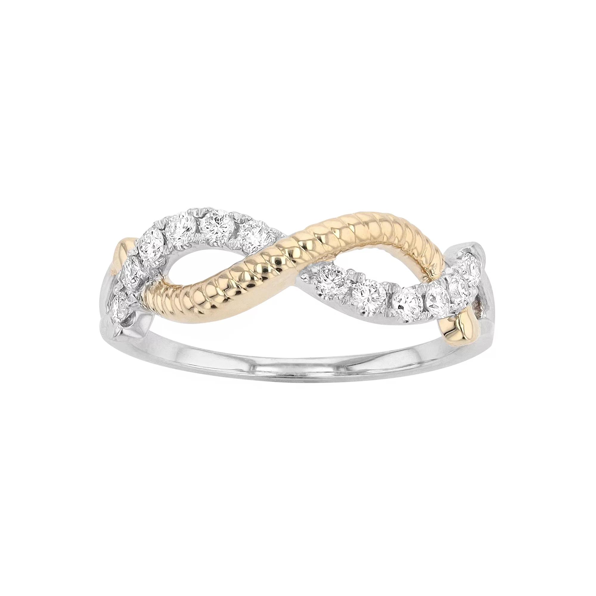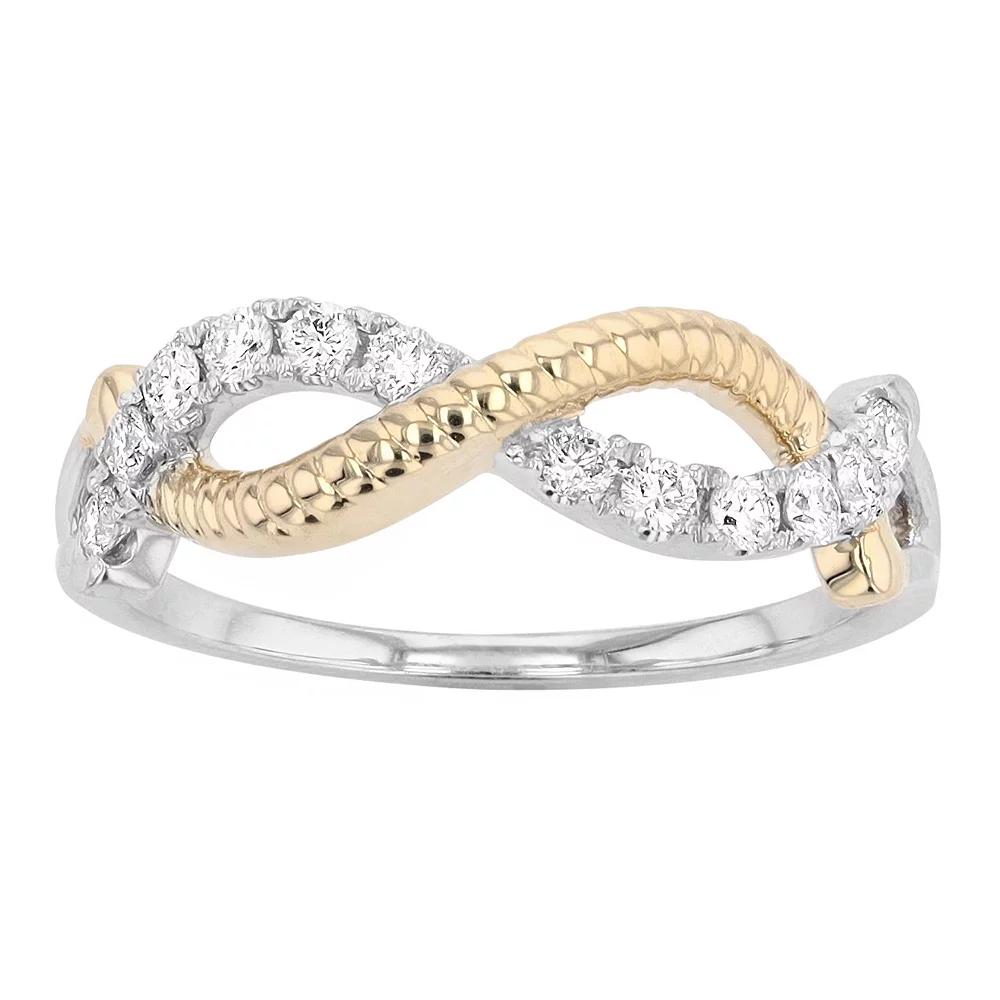 Add a touch of elegance to your everyday wardrobe with this two-tone Ava Blue infinity ring. Add a touch of elegance to your everyday wardrobe with this two-tone Ava Blue infinity ring. Nickel free Metal: 14k gold Packaging: boxed Plating: rhodium Ring width: 0.23 in. Finish: polishedDIAMOND DETAILS Total weight: 1/4 ct. Shape: round brilliant Setting: pave Color grade: H-I Clarity grade: SI-SI2 Diamond weights are approximate. Diamond Total Weights may vary between .01 and .13 ct. Some diamonds consist of fewer than 17 facets. Gemstones may have been treated to enhance their appearance. Special care may be required. Please visit our Gemstone Treatment & Special Care Guide for more information. Please note, due to the high value of this item, a signature may be required upon delivery. Color: Multicolor. Gender: female. Age Group: adult.