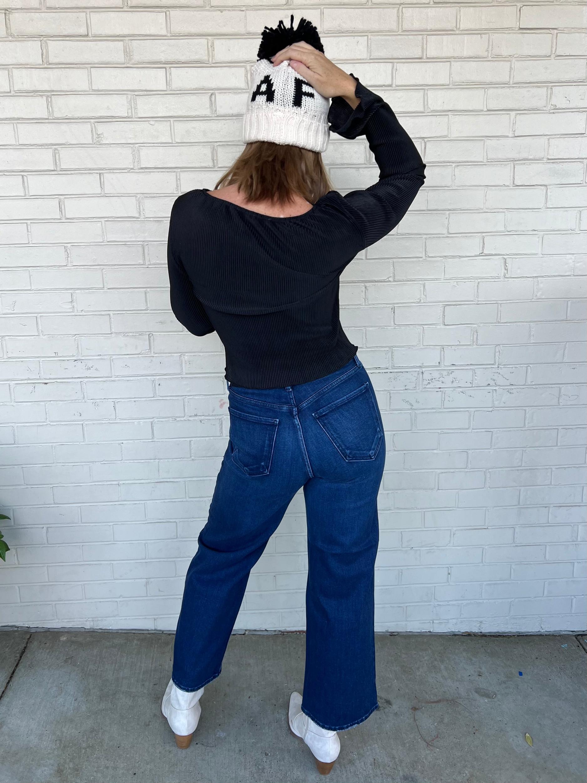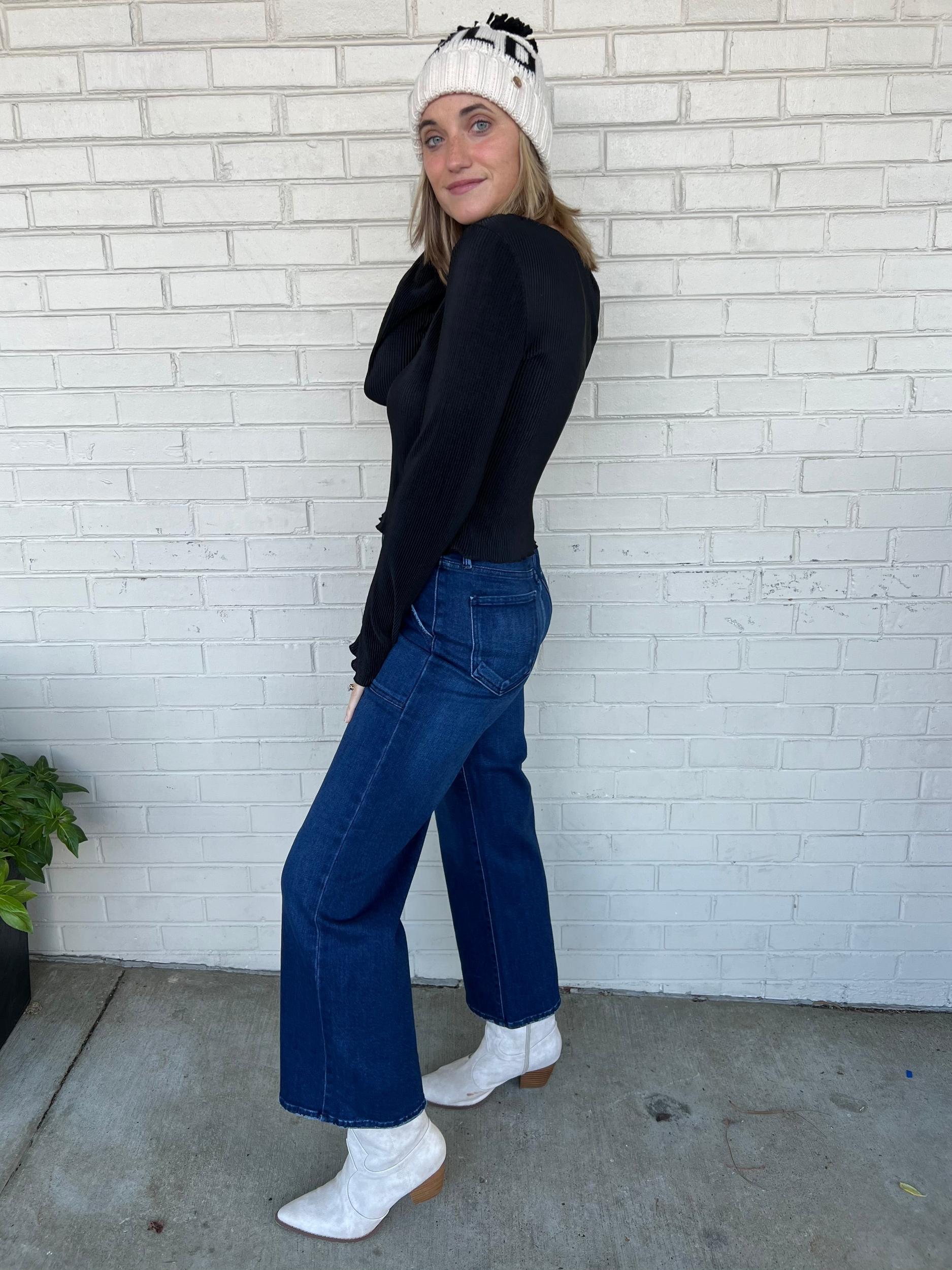Introducing Ava Wide Leg Jeans: the perfect blend of comfort and style. Made with stretchy dark denim, these high-waisted jeans offer a wide leg silhouette and large front pockets for added convenience. Upgrade your wardrobe with this quirky and fun addition!