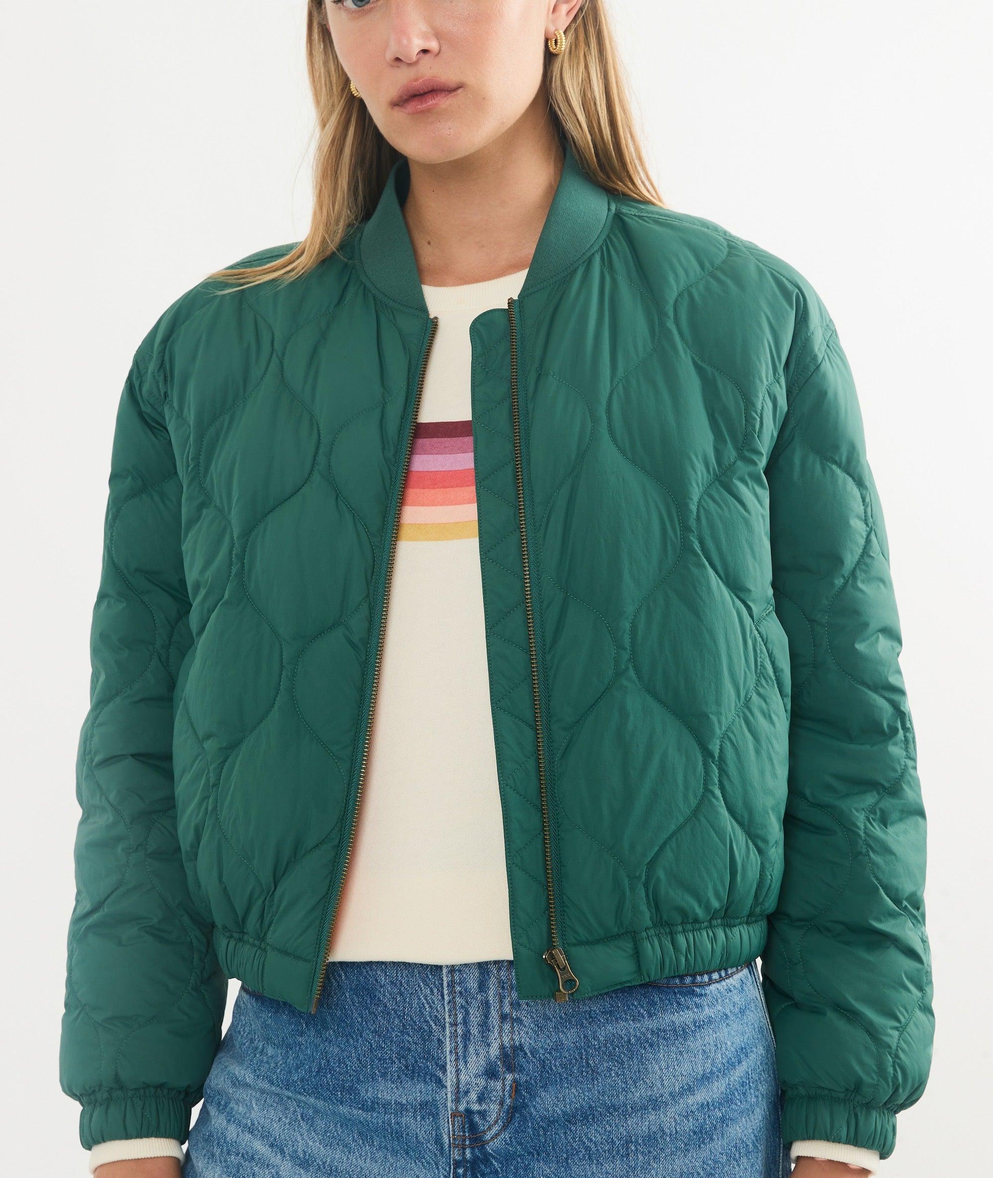 We wanted to make an easy, versatile jacket that you can wear pretty much anywhere. This quilted bomber is slightly oversized, has a subtly cropped length, interior and exterior pockets, as well as a warm, incredibly lightweight nylon fabric. So go ahead, wear it on your morning walks, to the farmers market, parklet dinners, you name it.