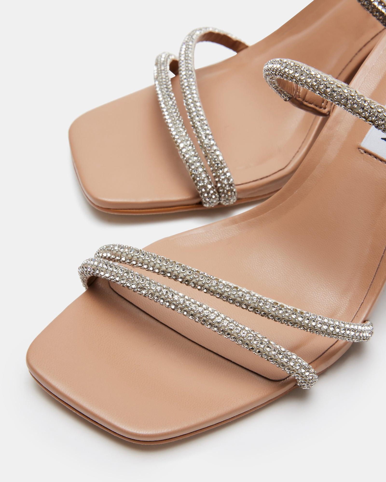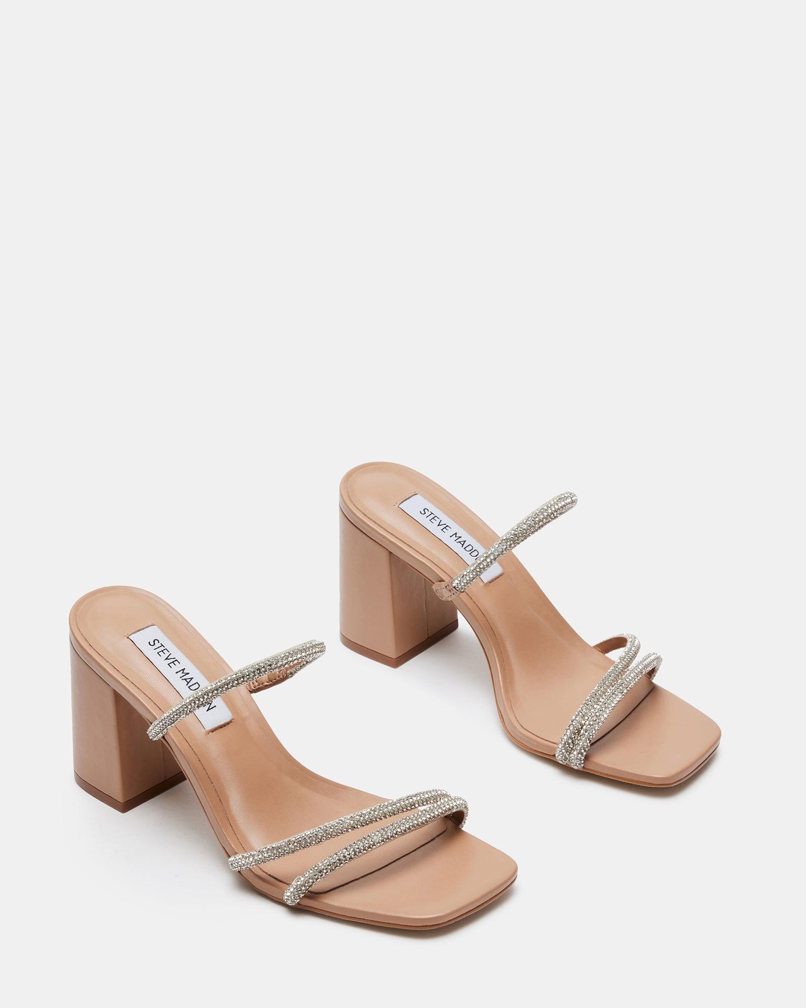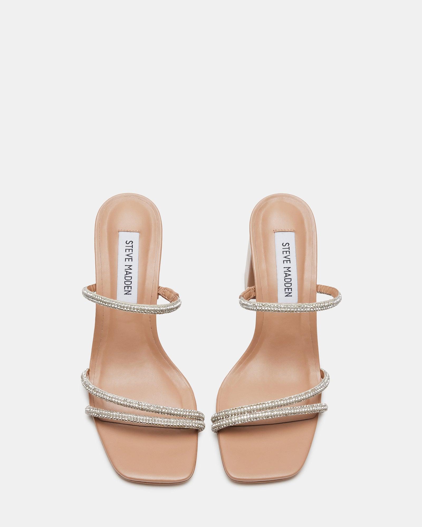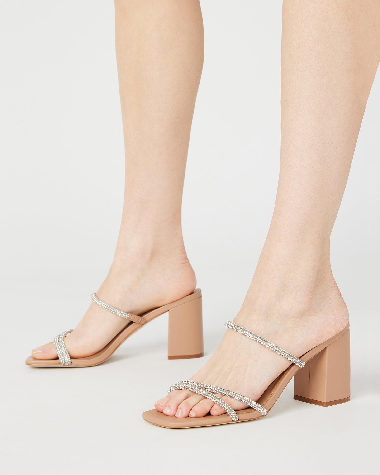 MINIMALIST + MODERN + SUNNY It doesn't get easier than a slip-on sandal with a block heel like AVANI Rhinestones. Plus, this slide design includes details like rhinestone-encrusted tubular straps and a square toe to elevate the look. Square toe block heel slide sandal with rhinestone embellishment Slip-on style Rhinestone embellished tubular straps 3.25 inch heel height Micro suede upper material with stones Vegan leather lining Vegan leather sock Synthetic sole Imported