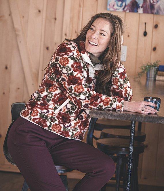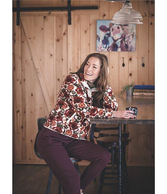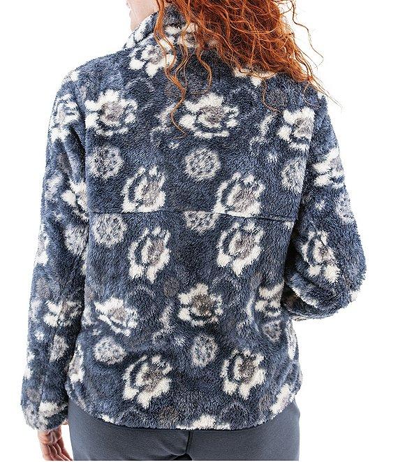 From Aventura, this top features: Soft pile fleece fabrication Pullover silhouette Allover print Stand collar neckline Long sleeves Front pockets Front snap closure Woven trim detail Relaxed fit Straight hemline Pullover construction Approx. 24.5" length Recycled polyester Machine wash Imported.