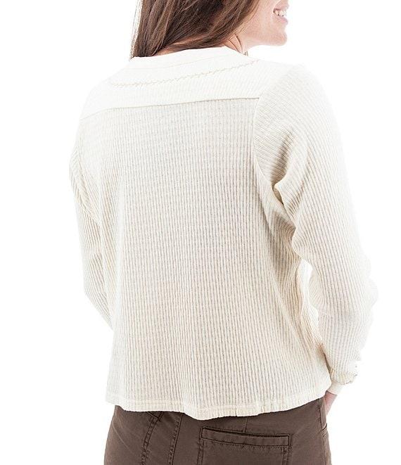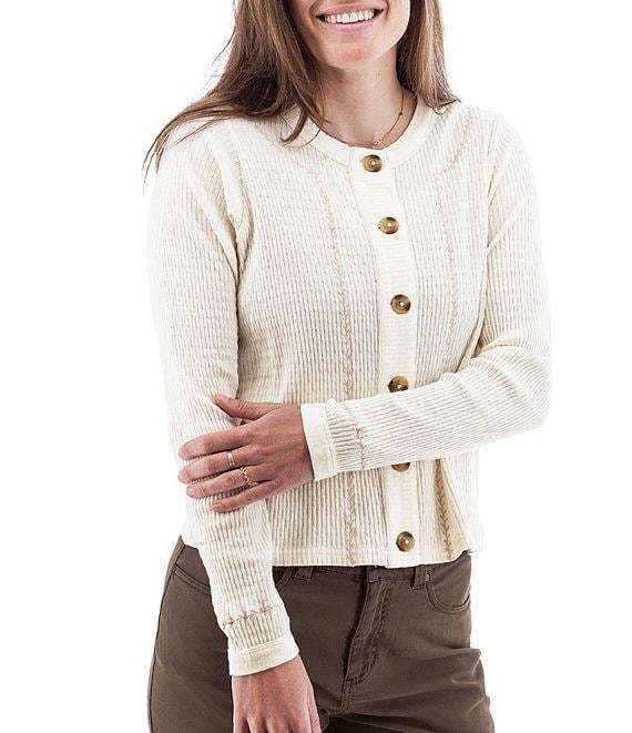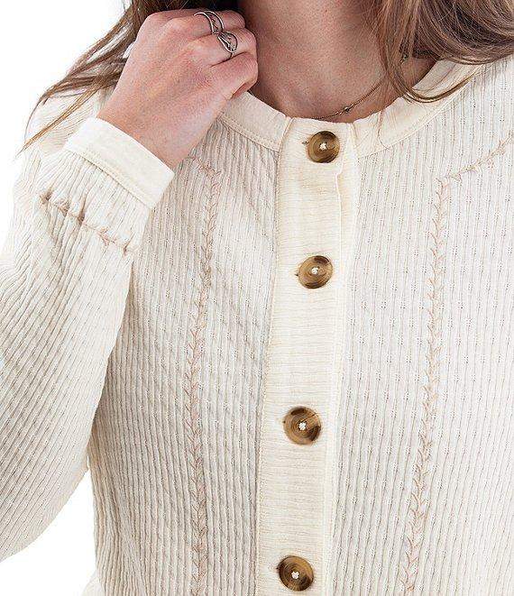 From Aventura, this top features: Knit fabrication Cardigan silhouette Crew neckline Long sleeves with banded cuffs Embroidered detail Back yoke Fitted fit Straight hemline Button front closure Approx. 23" length Organic cotton Machine wash Imported.