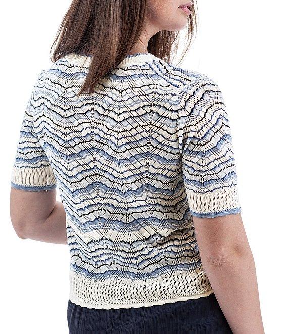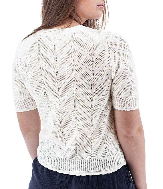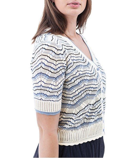 From Aventura, this cardigan features:Knit fabricationCrop silhouetteZig-zag patternV-neckline Short sleeves Fine gauge Rib knit trim at front placket, neck trim, sweep and cuffsStandard fit Straight hemline Button front closure Approx. 22" lengthOrganic cotton/viscose Machine washImported.