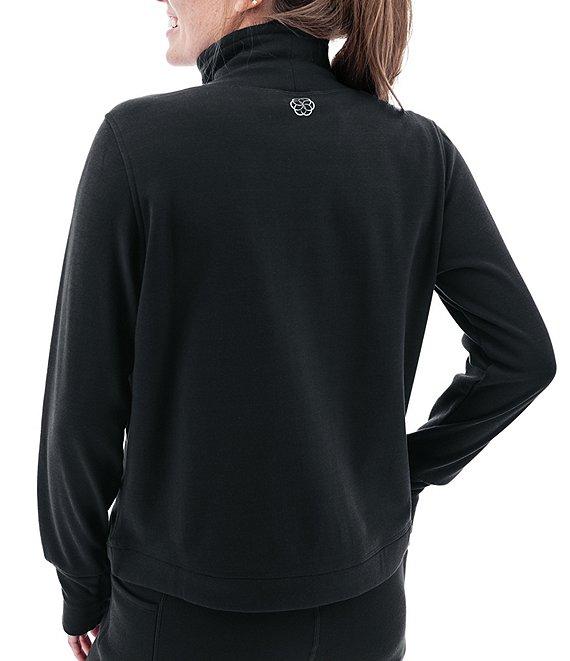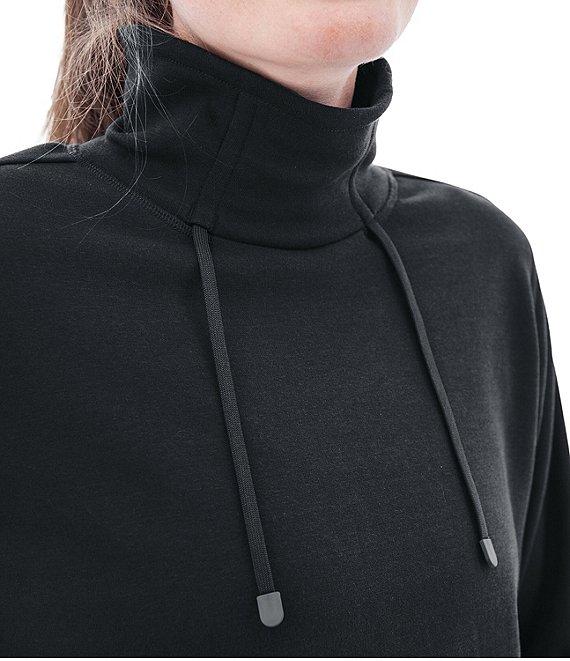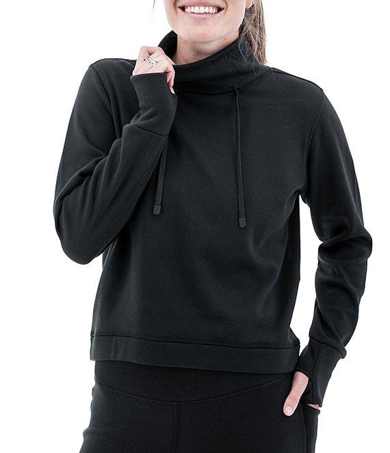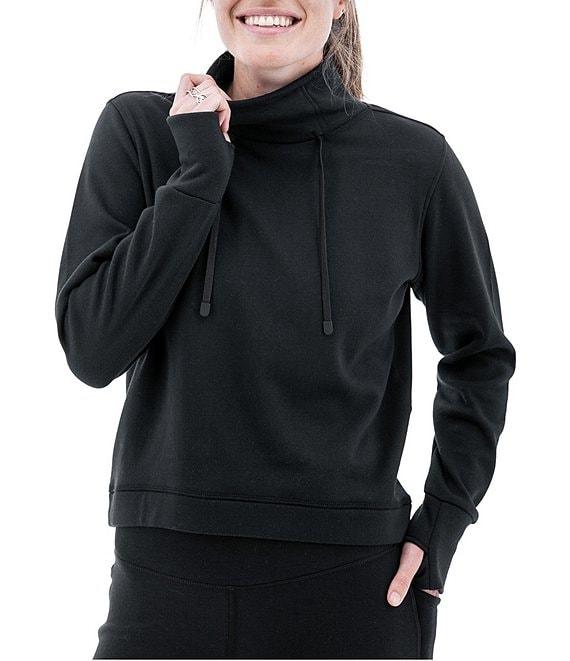 From Aventura, this top features: Plush fleece fabrication Mock neck Long sleeves with thumbholes Slightly rounded hemline Pullover construction Approx. 22" front length; 24.5" back length Recycled polyester/polyester/cotton/spandex Sustainable Machine wash cold/tumble dry low Imported.