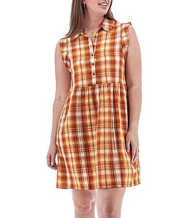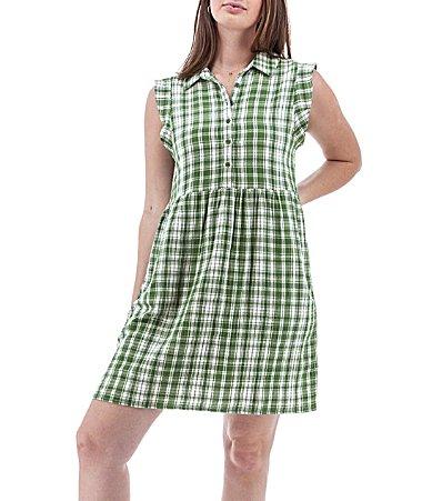 From Aventura, this dress features:Gauze yarn-dye woven fabricationA-line silhouette Plaid print Point collar neckline Flutter sleevesButton front closureHip pocketsRelaxed fit Straight hemline Pullover constructionApprox. 36.5 lengthOrganic cottonMachine washImported.