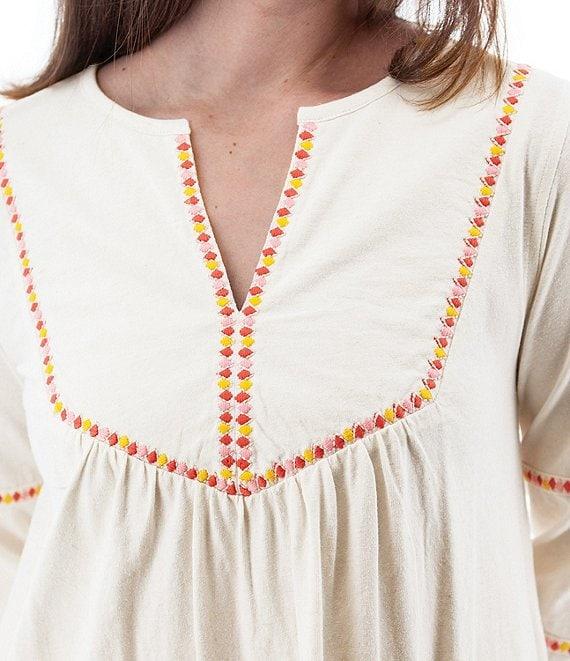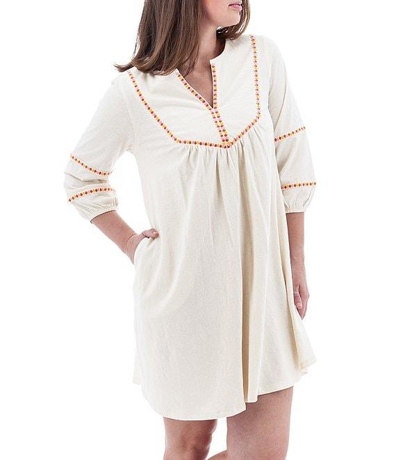 From Aventura, this dress features: Slub knit jersey silhouette Peasant silhouette Split v-neckline 3/4 sleeves with elastic cuffs Embroidered detail on front yoke, neck opening and sleeves Hip pockets Relaxed fit Straight hemline Pullover construction Approx. 36.5" length Organic cotton/hemp Machine wash Imported.