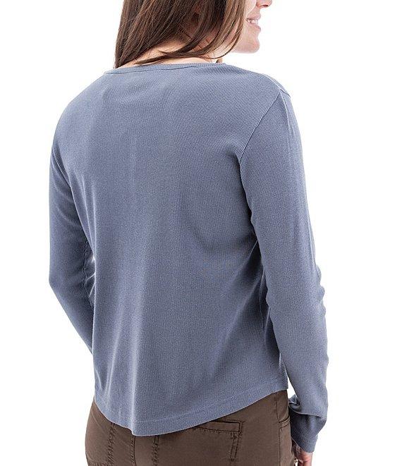 From Aventura, this top features: Rib knit fabrication Henley silhouette V-neckline Long sleeves Embroidered detail Fitted fit Shirttail hemline Pullover construction Approx. 24.5" length Organic cotton/tencel/lyocell Machine wash Imported.